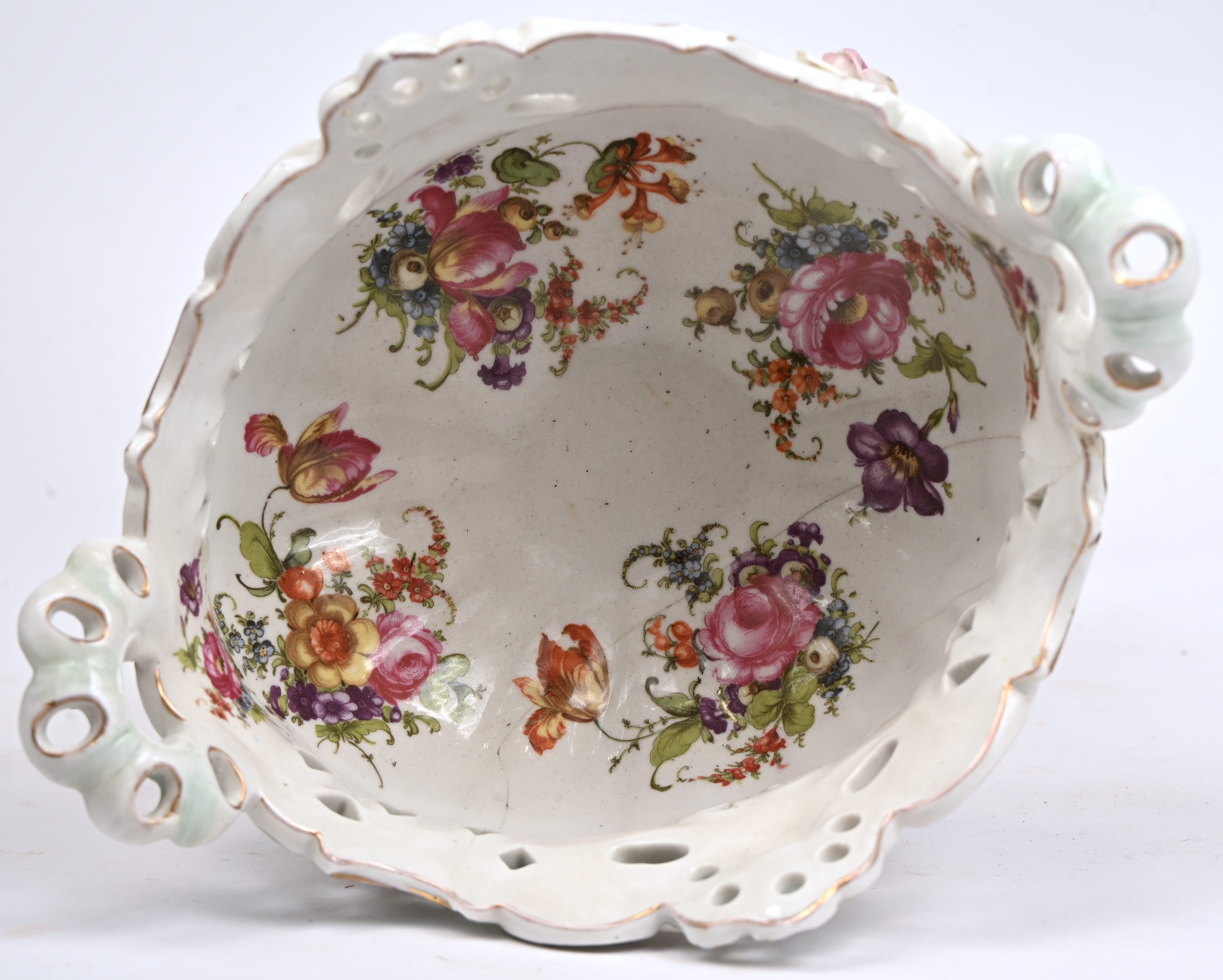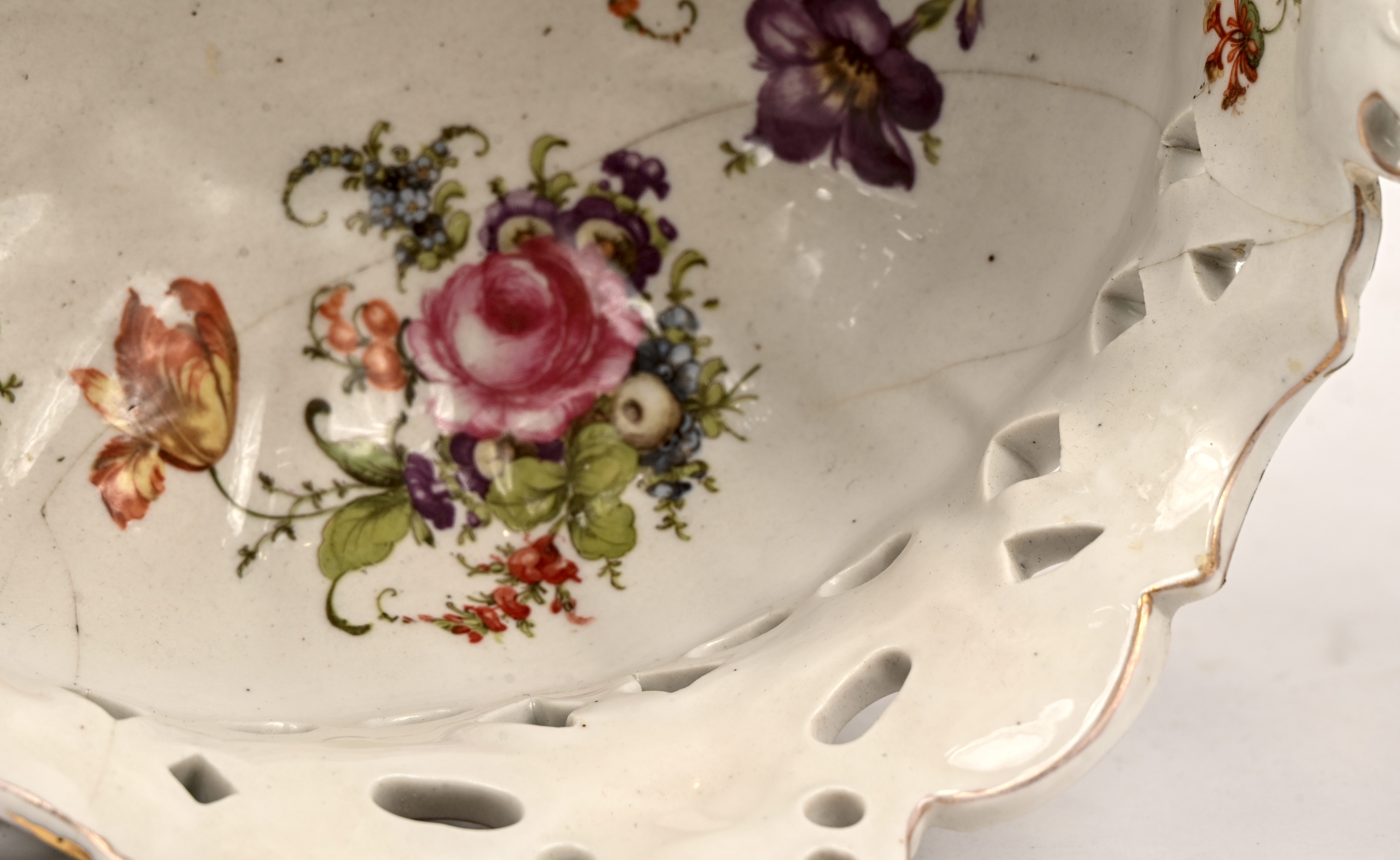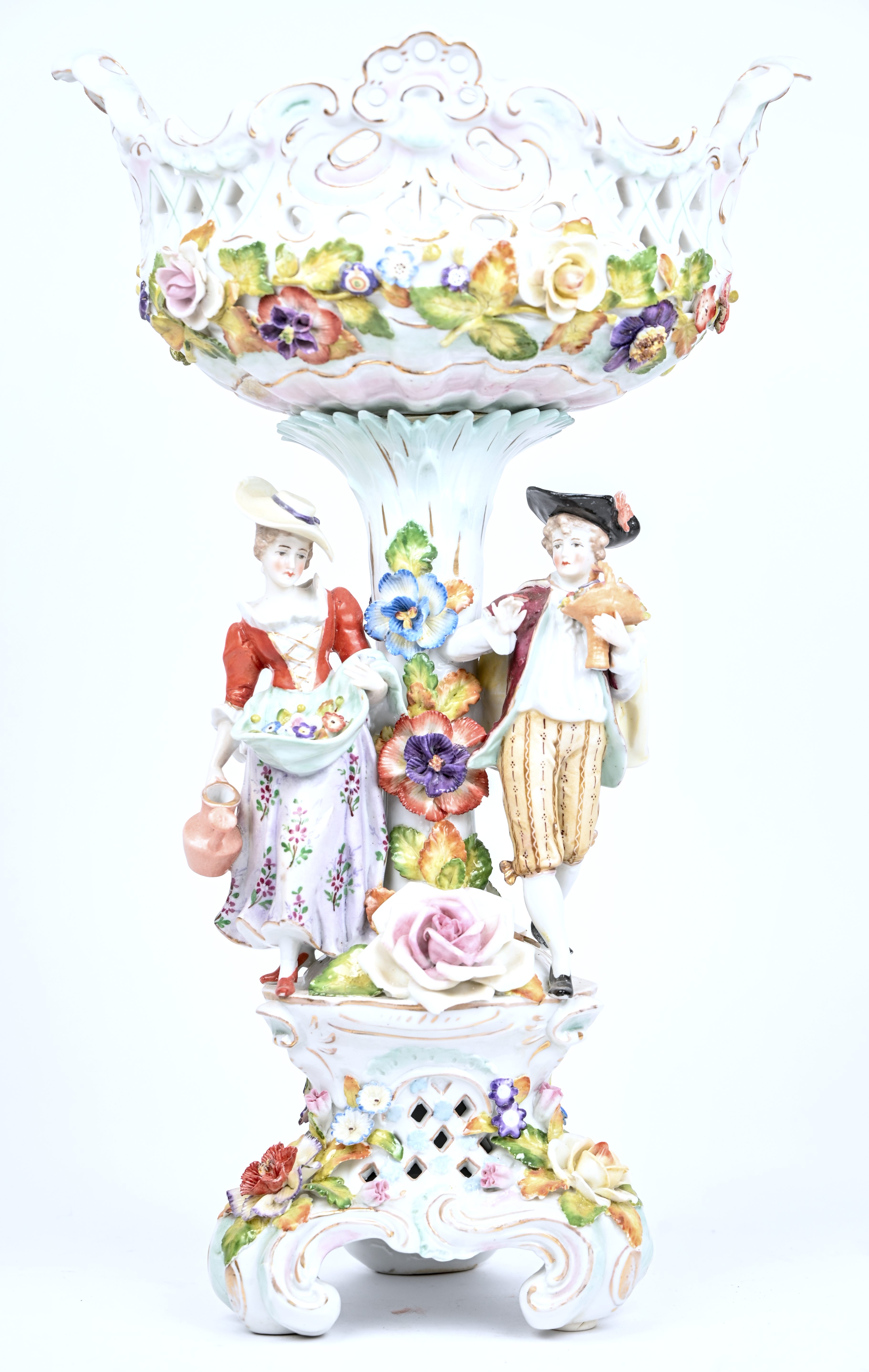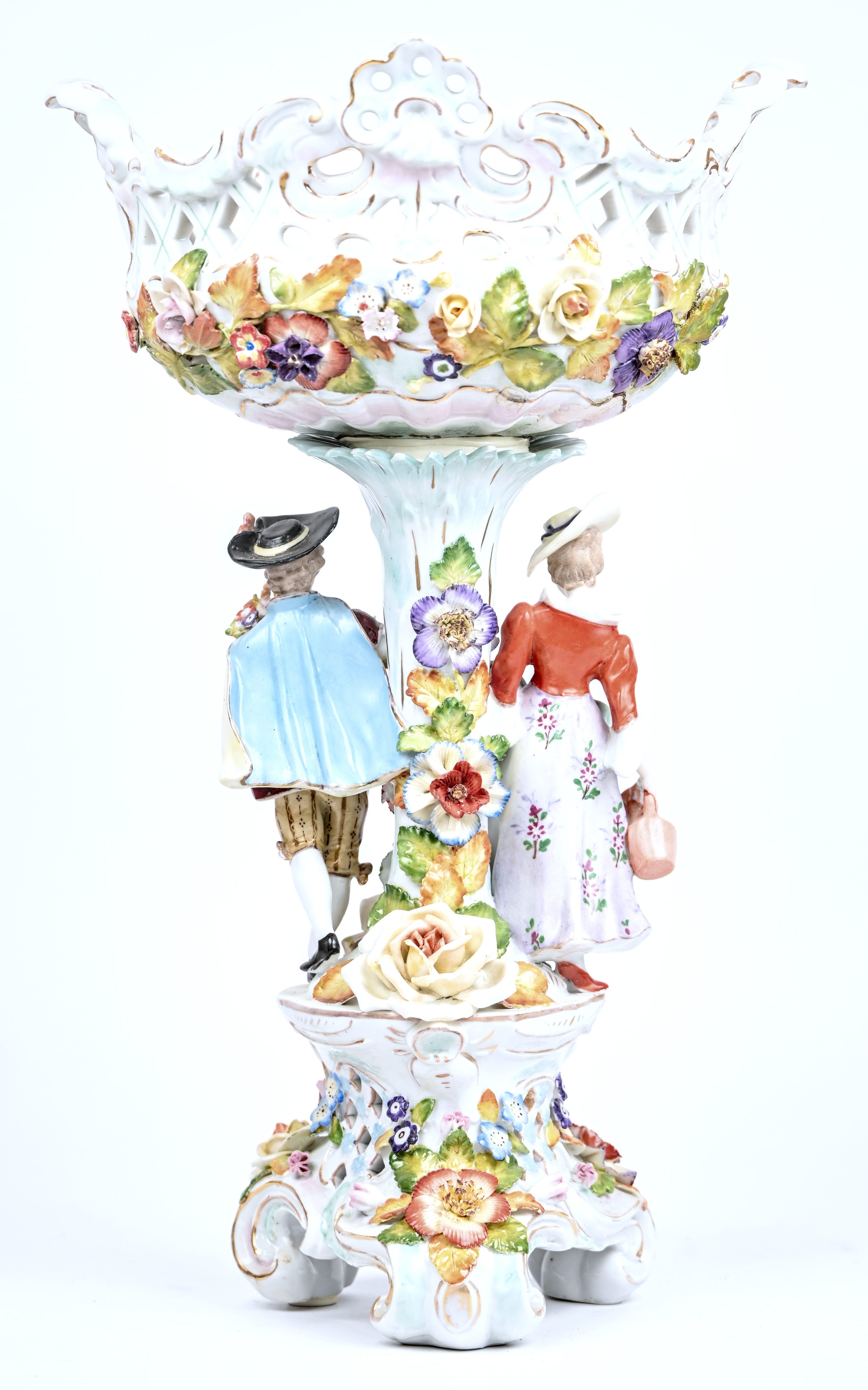 A porcelain centerpiece decorated with flowers and a young couple. Hairline crack in the bowl. Marked.