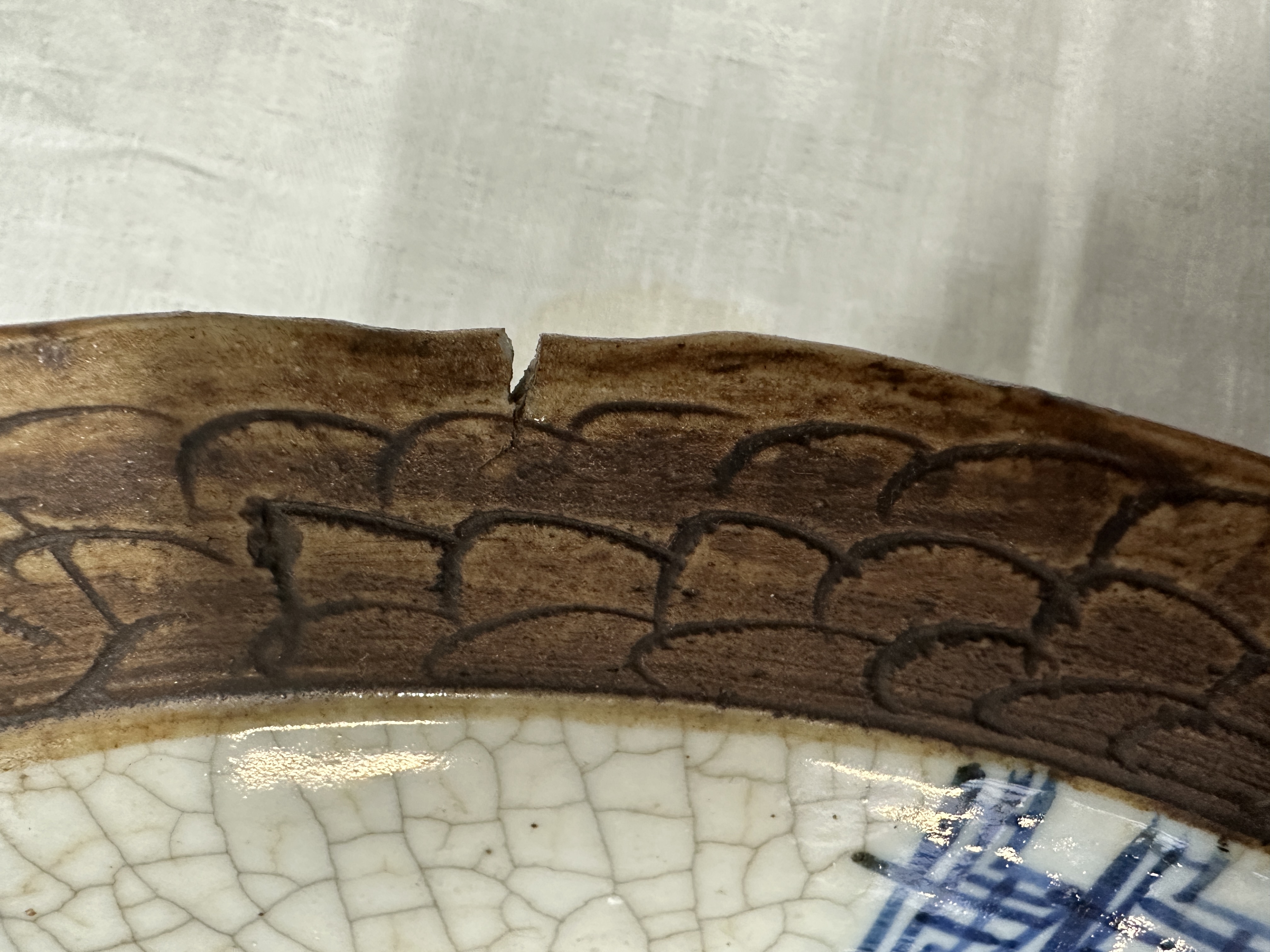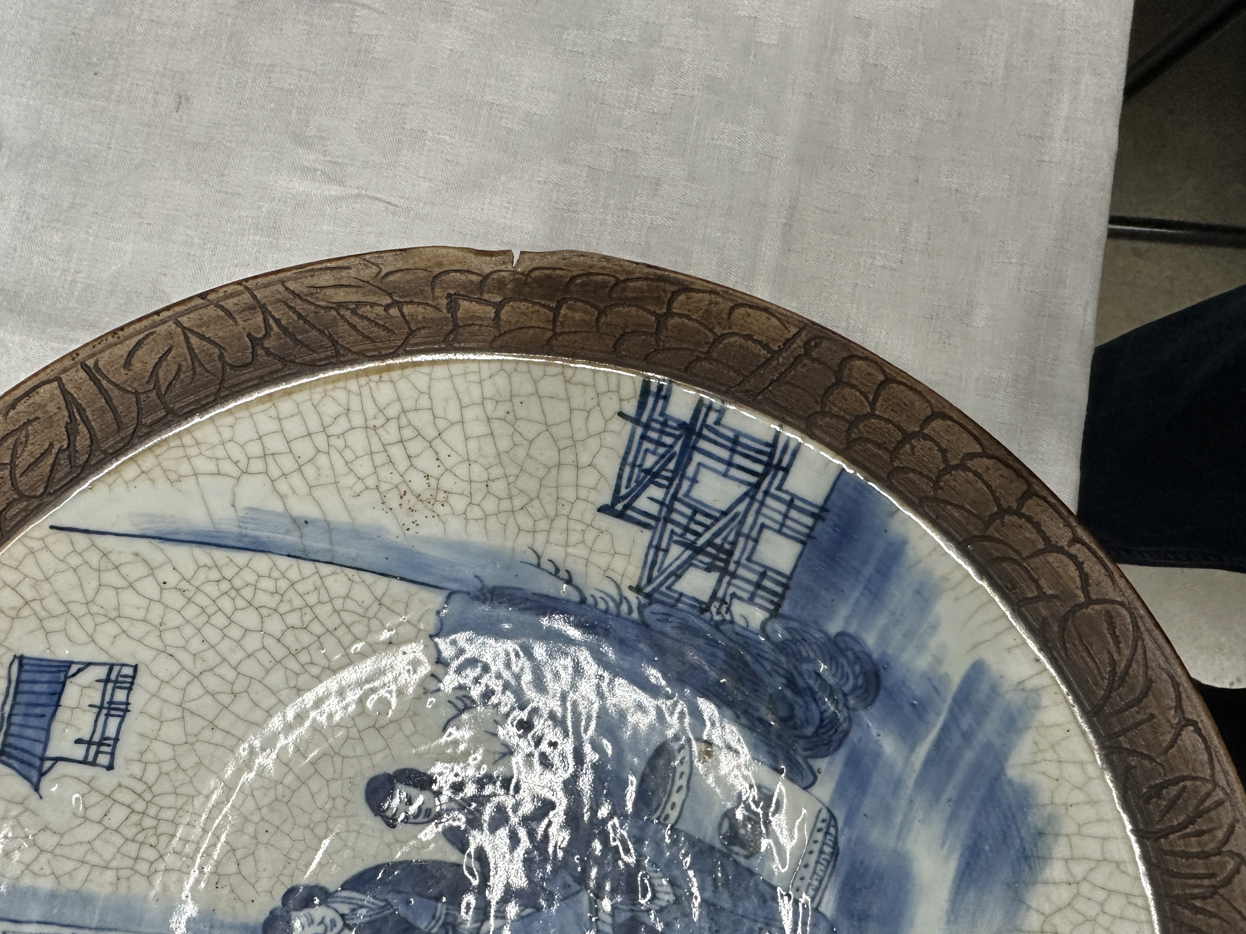 Een porseleinen Nanking schotel met figuren in het decor, gemerkt. Kleine inkerving aan de rechterkant.
