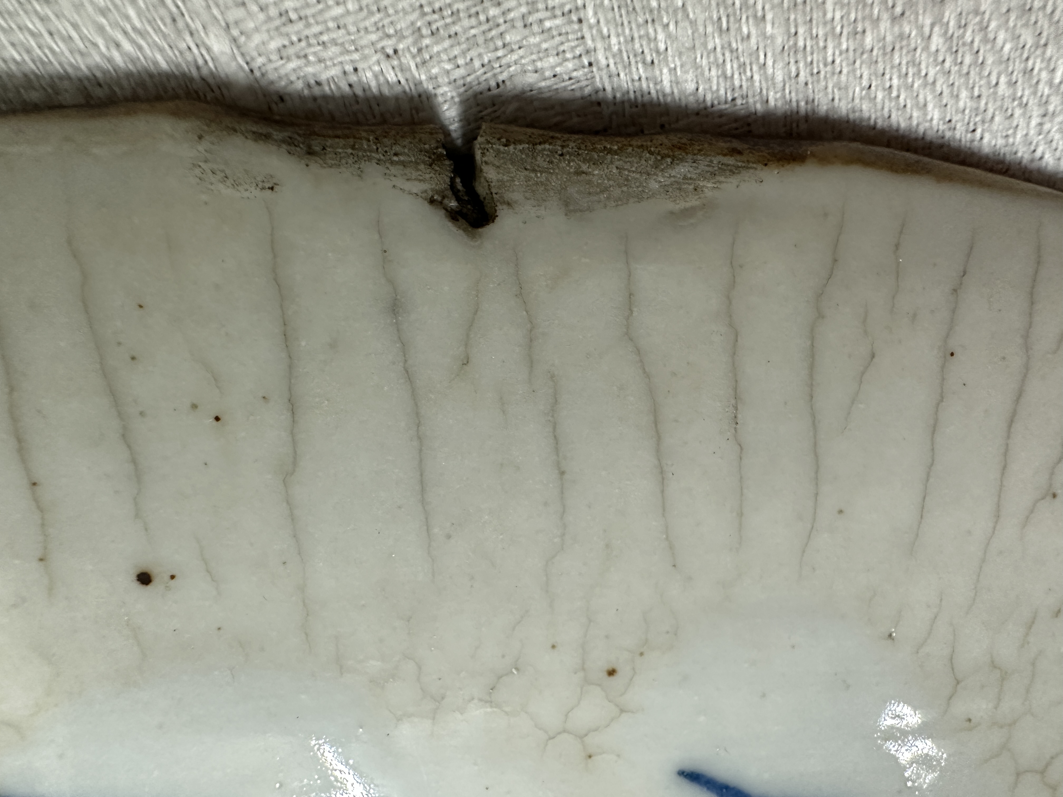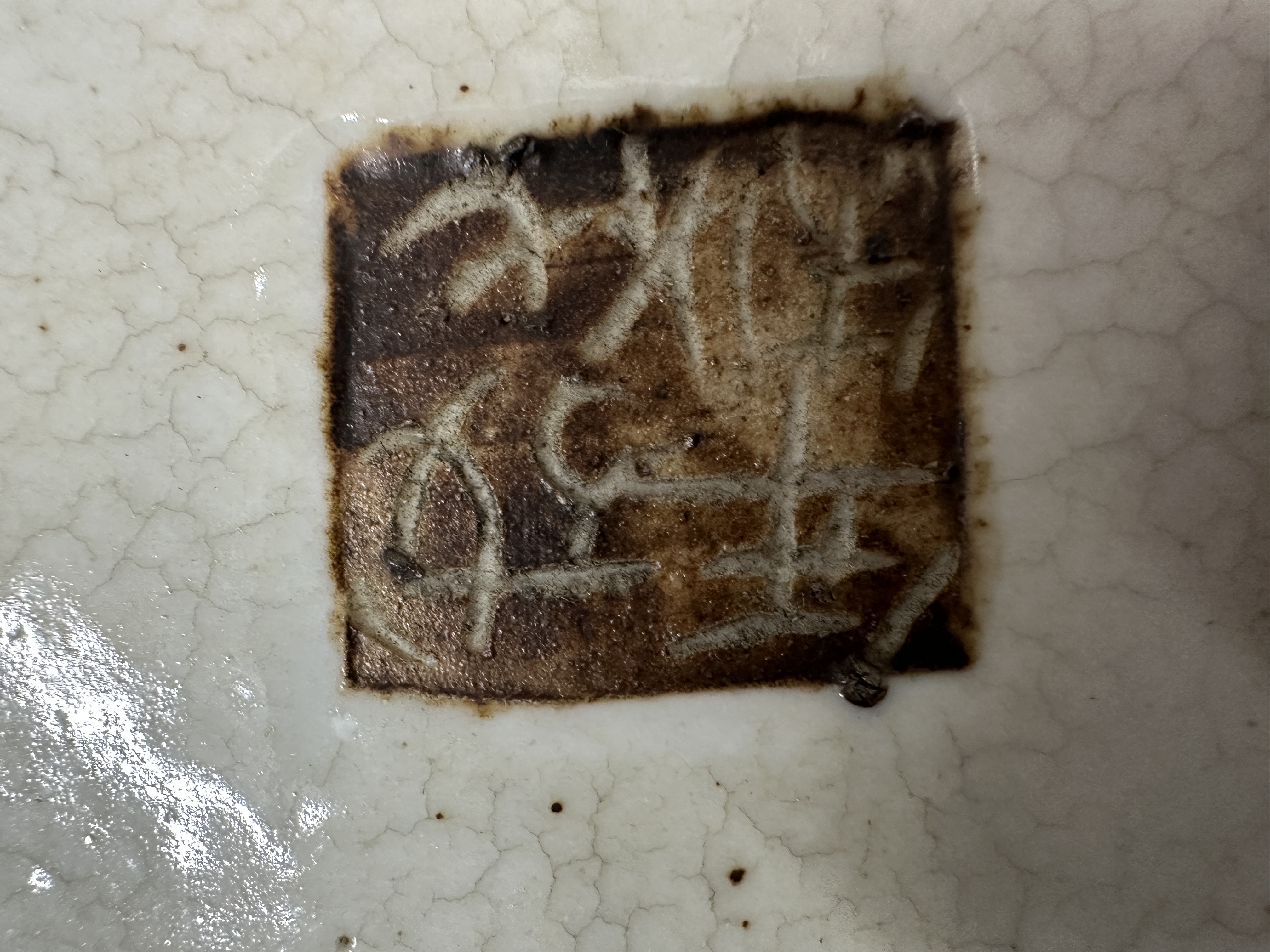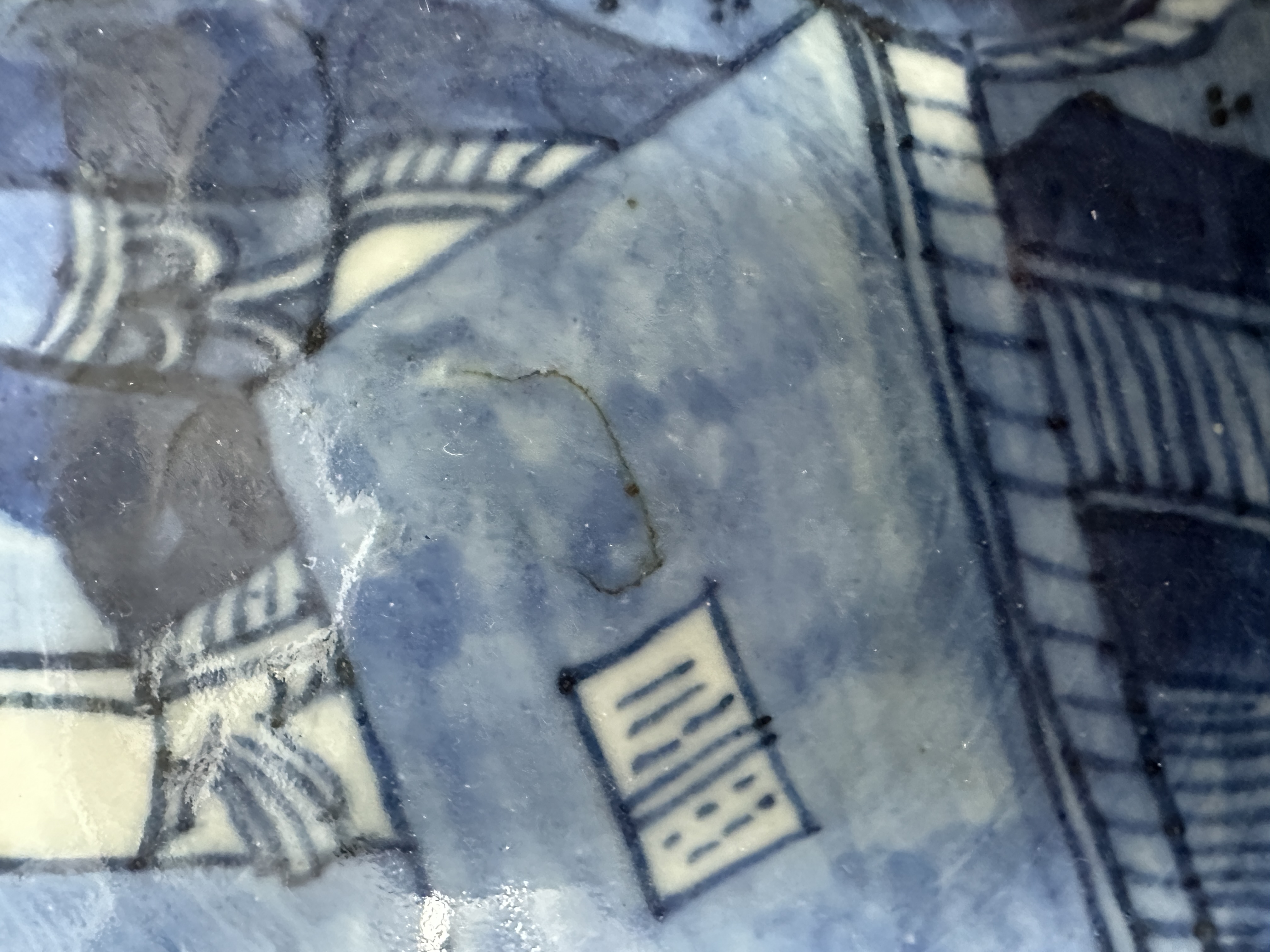 A porcelain Nanking dish decorated with figures, marked. Small notch in the right side.