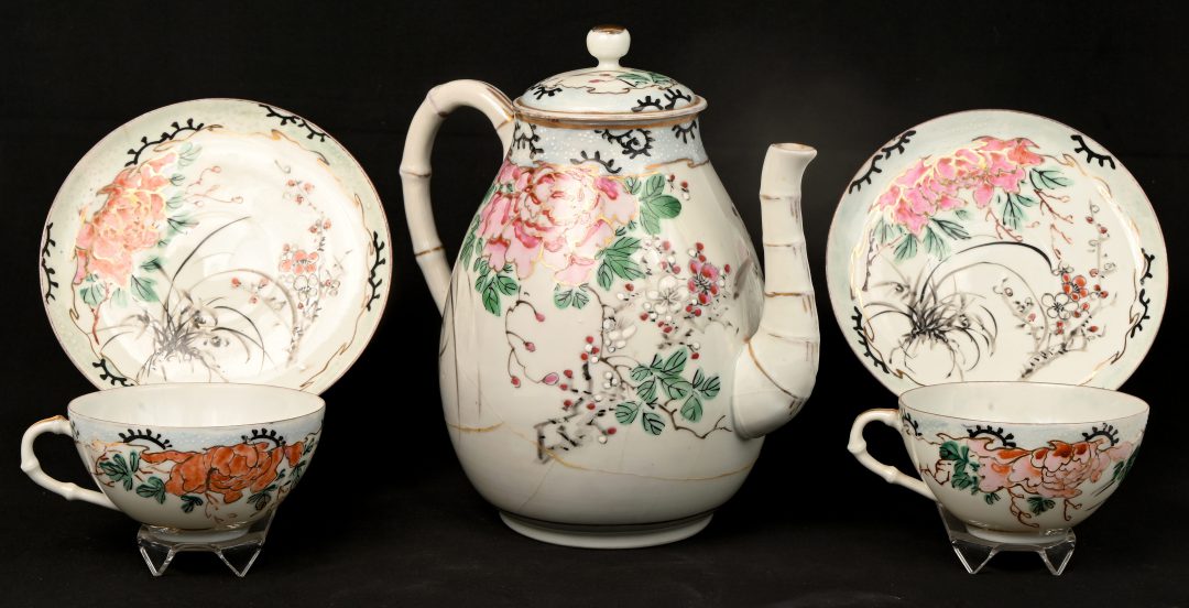 Een porseleinen theekan en twee kopjes en schoteltjes. Versierd in de geest van Kakeimon. Kan beschadigd.