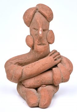 #401ChupicuaroPeriod: 100BC-100ADEen precolumbiaans beeldje van een zittend figuur met armbanden. Colima, Mexico. In 1975 aangekocht bij Galerie Mermoz, Parijs.