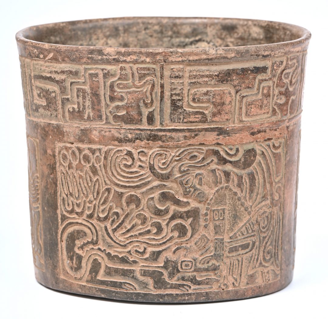 Een precolumbiaanse vaas van aardewerk met figuren en dieren in relief, in precolumbiaanse stijl.