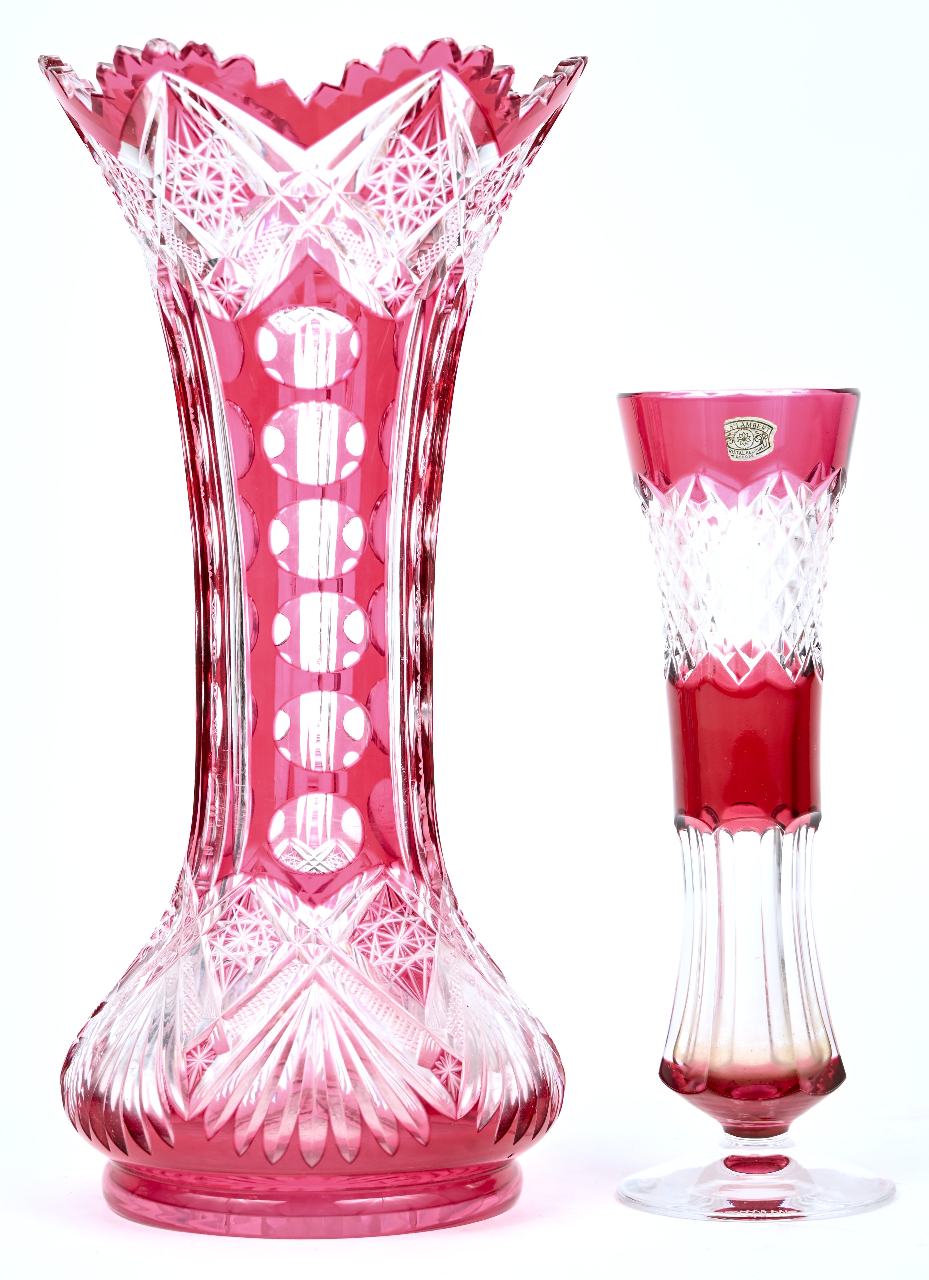 A slender crystal vase, colored pink in the mass, marked Val Saint Lambert. Included is a Bohemian crystal vase with minor rim damage.