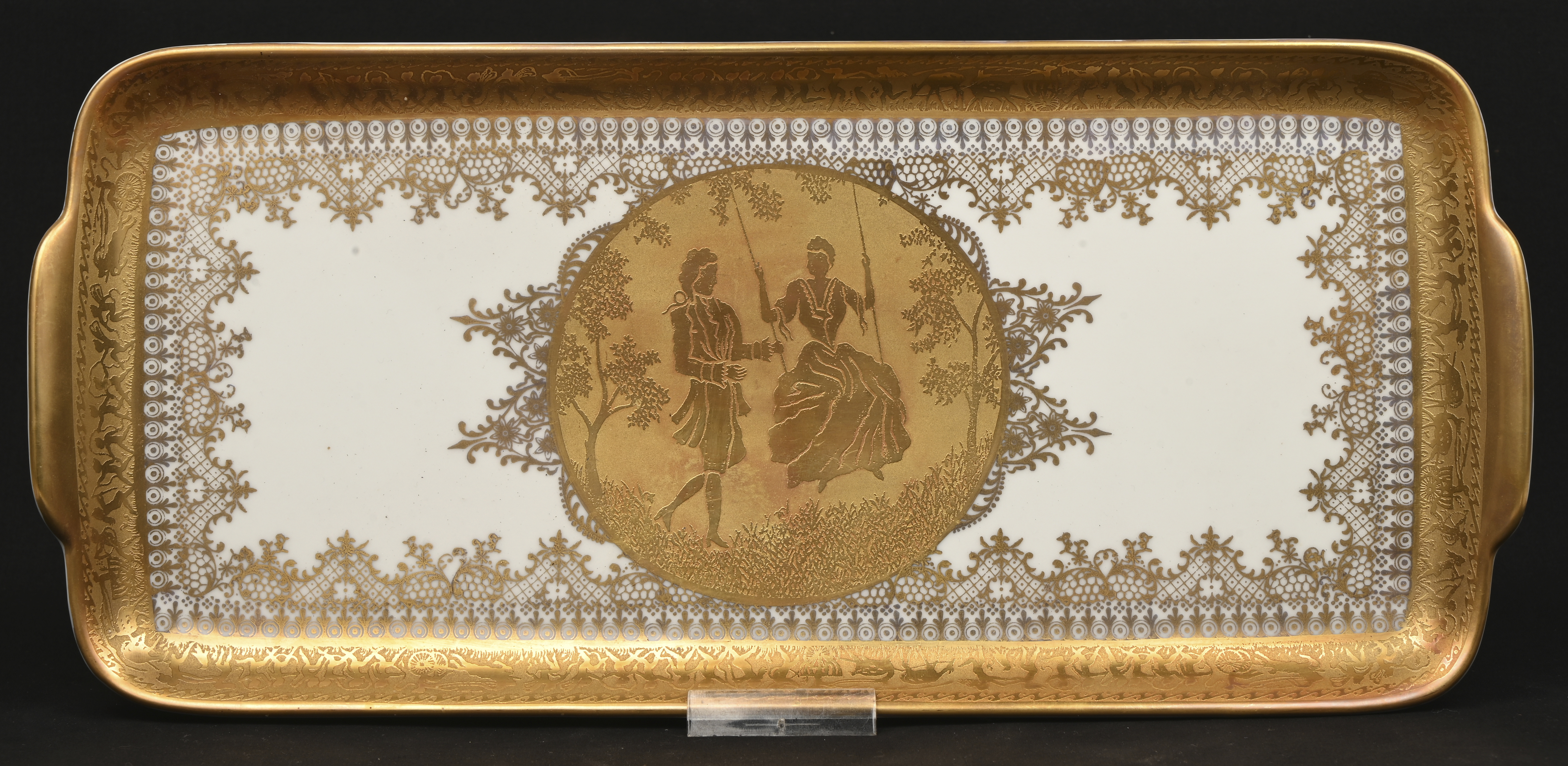 A rectangular dish with gilded decoration. Marked.