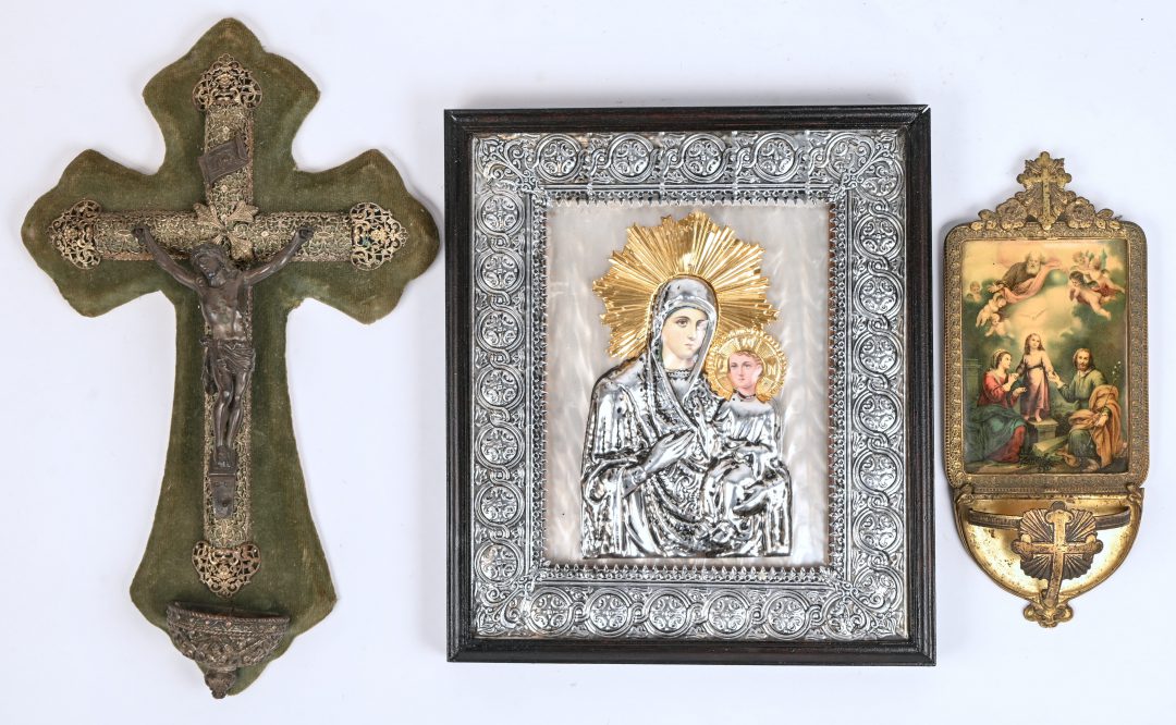 Een religieus lot bestaande uit een icoon, een kruisbeeld en een onvolledig wijwatervat.