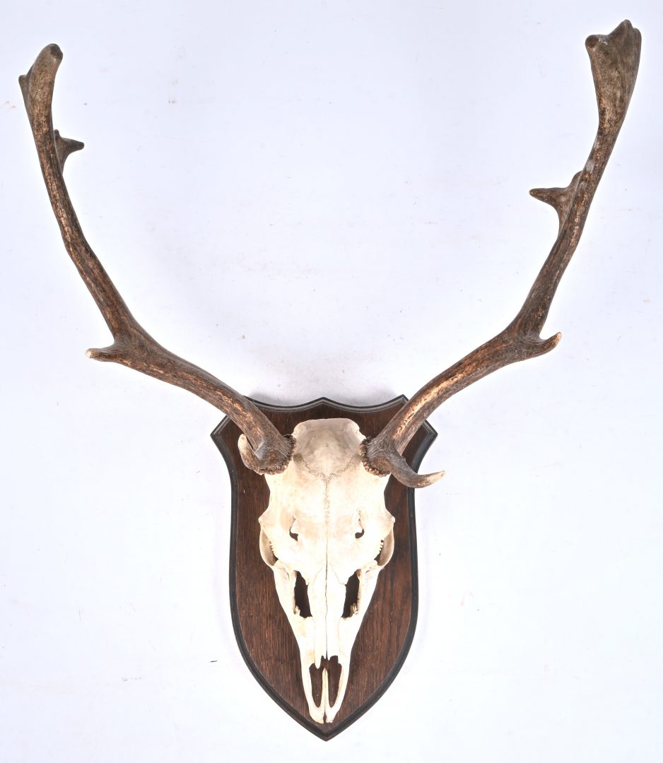 #49Een hertengewei, gemonteerd op een houten schild.