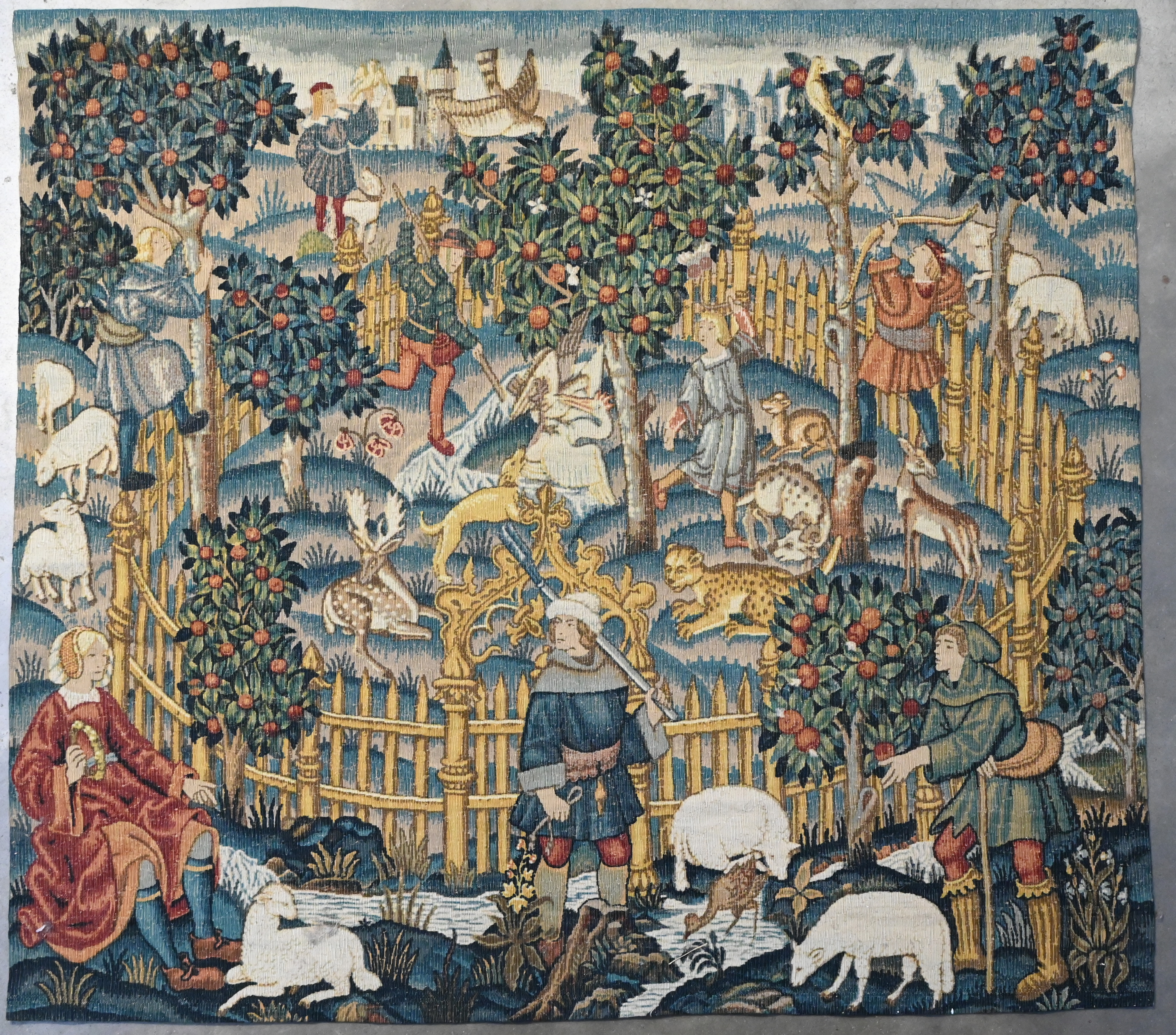 #437Een handgeknoopt Oosters tapijt met een decor van jagers en exotische dieren.