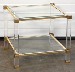 A square vintage coffee table, brass, glass, and plexiglass, marked Pierre Vandel. -