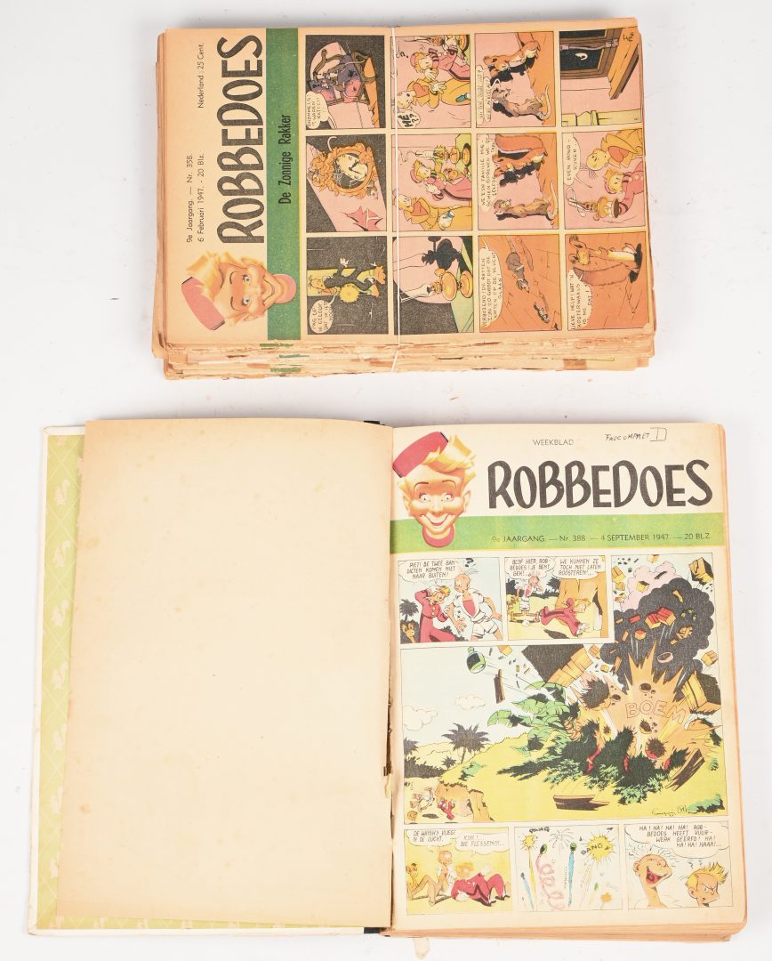 Een Robbedoes verzamelalbum 22. 1e druk. Bundeling weekblad Robbedoes. 9e jaargang, nr 388 - 4 september 1947. Bijgevoegd 18 Robbedoes weekmagazines. Medio 1947.