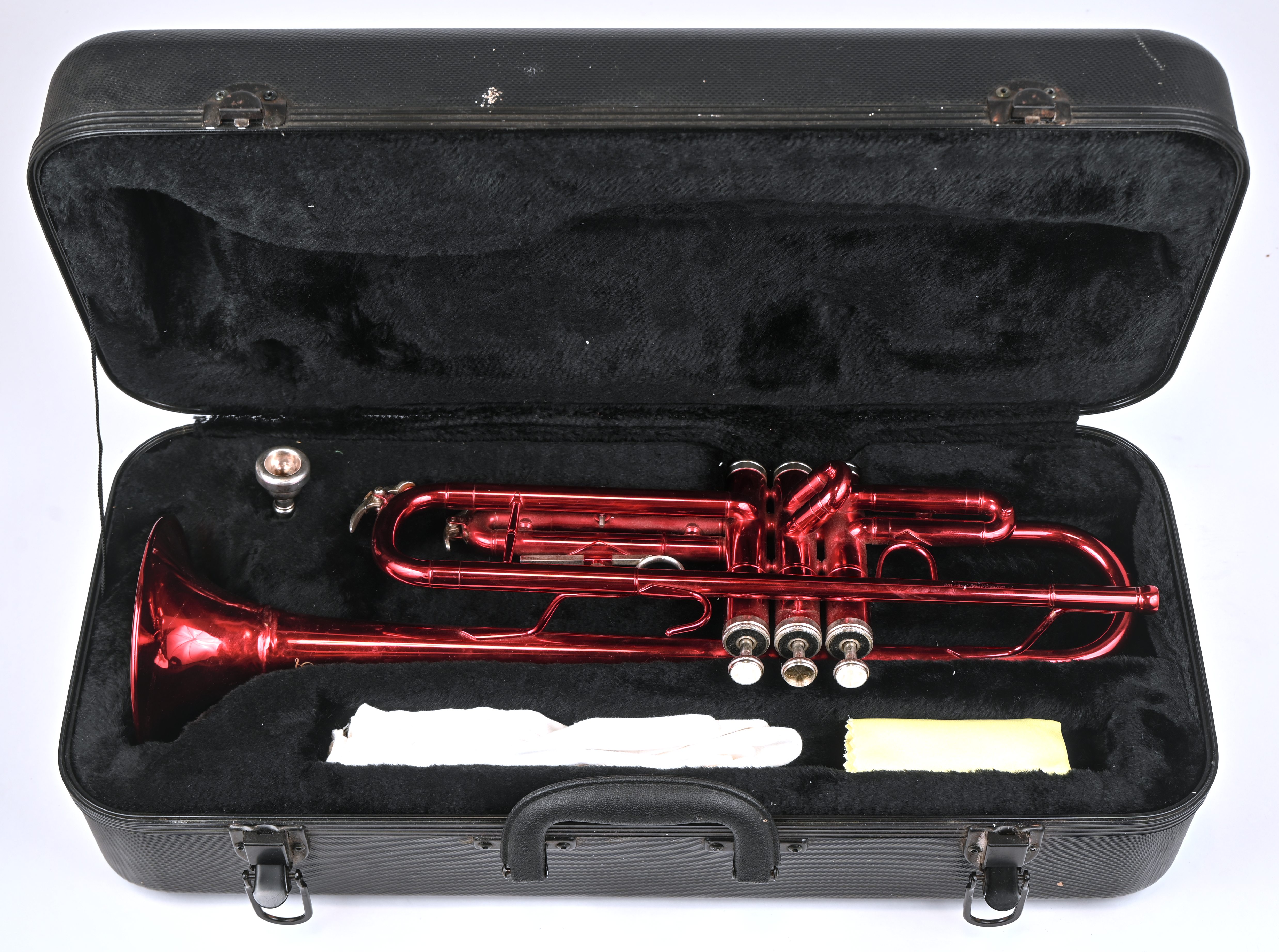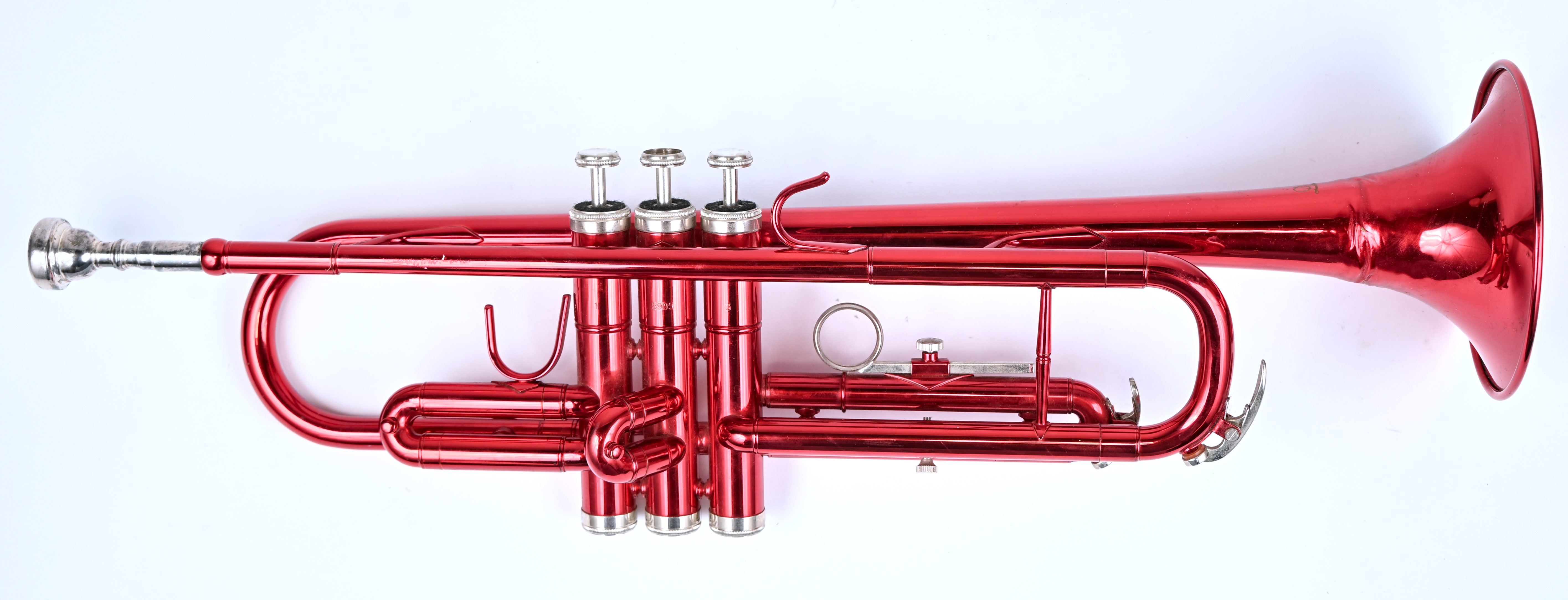 Een rode studietrompet in koffer, met kreukelschade aan de hoorn.