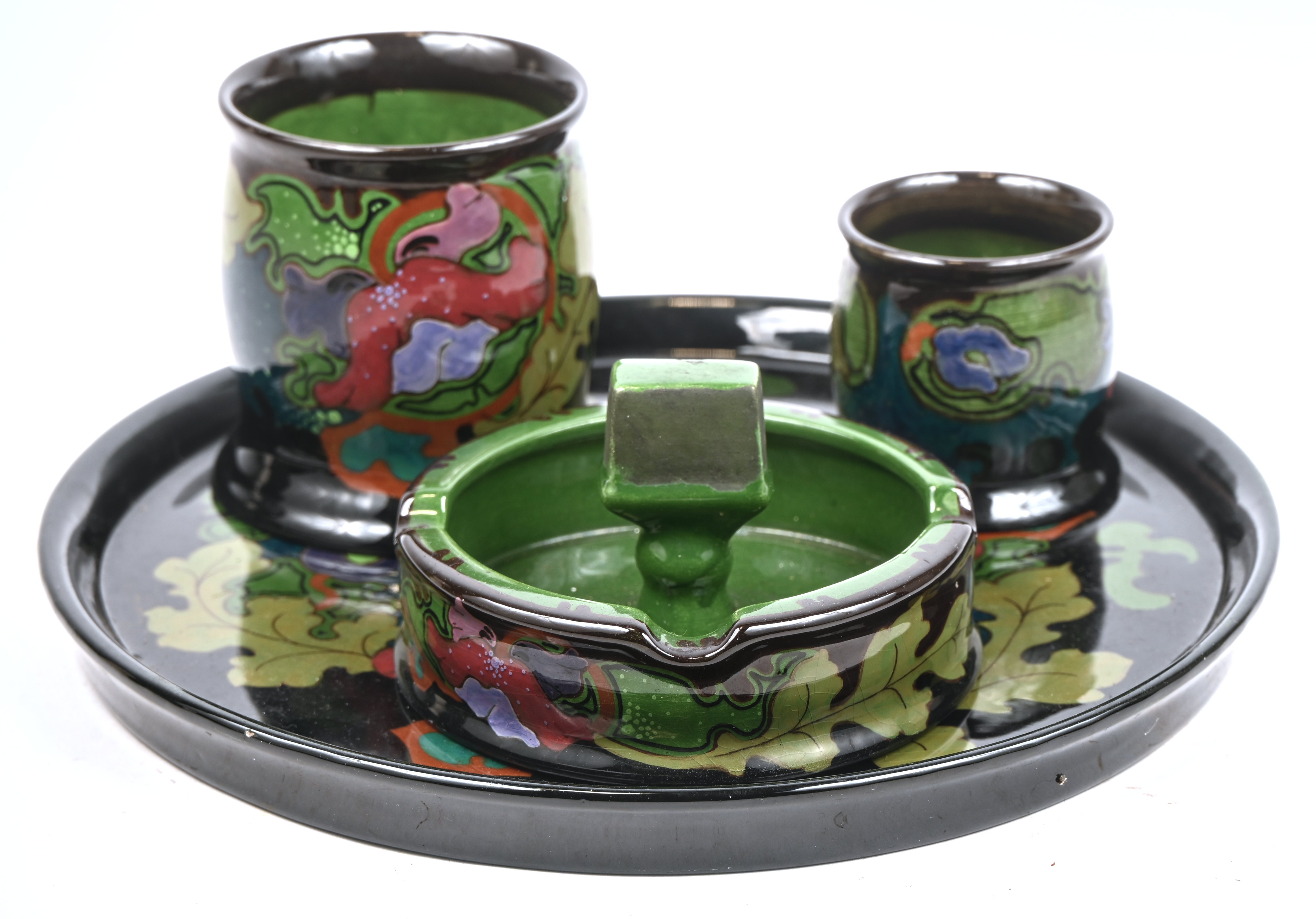 A smoking set of multicolored glazed pottery. Consisting of a tray, two jars, and an ashtray with match holder. Marked 'Regina, Gouda, Holland.'