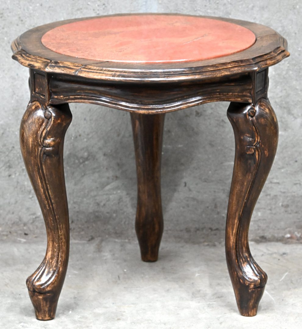 #67Een goudkleurig gepatineerd houten bijzetstoeltje met een geborduurde zitting.