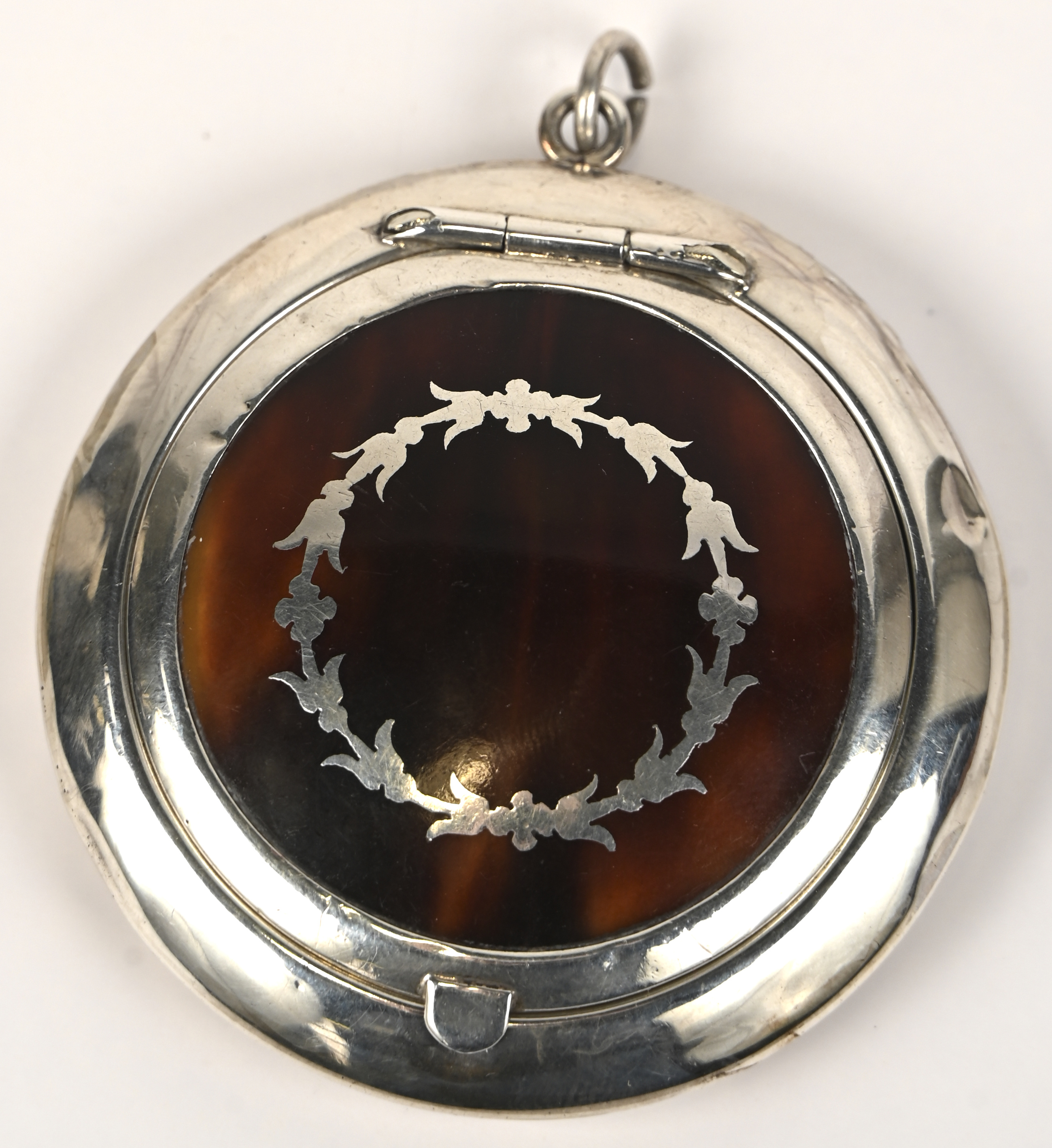 A round silver pillbox inlaid with tortoise shell and containing a mirror inside. Hallmarks from London, made by H.W. Ltd. R38. 20 g