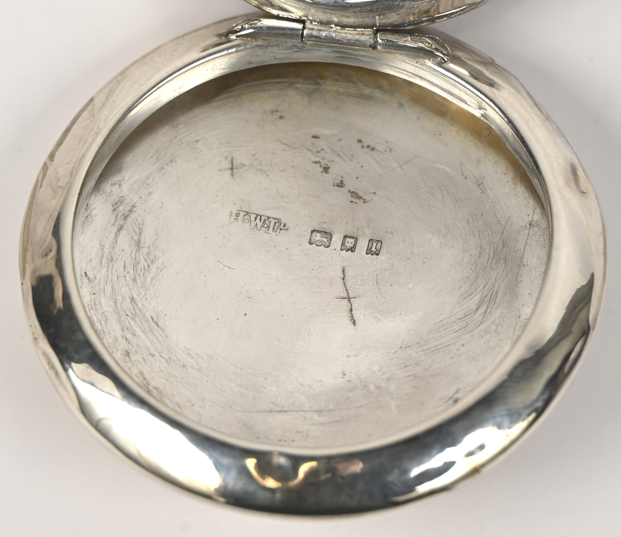 Een rond zilveren pillendoosje ingelegd met schildpad en met binnenin een spiegeltje. Keuren van Londen, maker H.W. Ltd. R38. 20 g