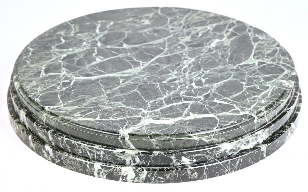 #61Een inktstel met smeedijzeren rozentak in de stijl van Van Boeckel. Op een witte marmeren voet, met twee inktpotten.