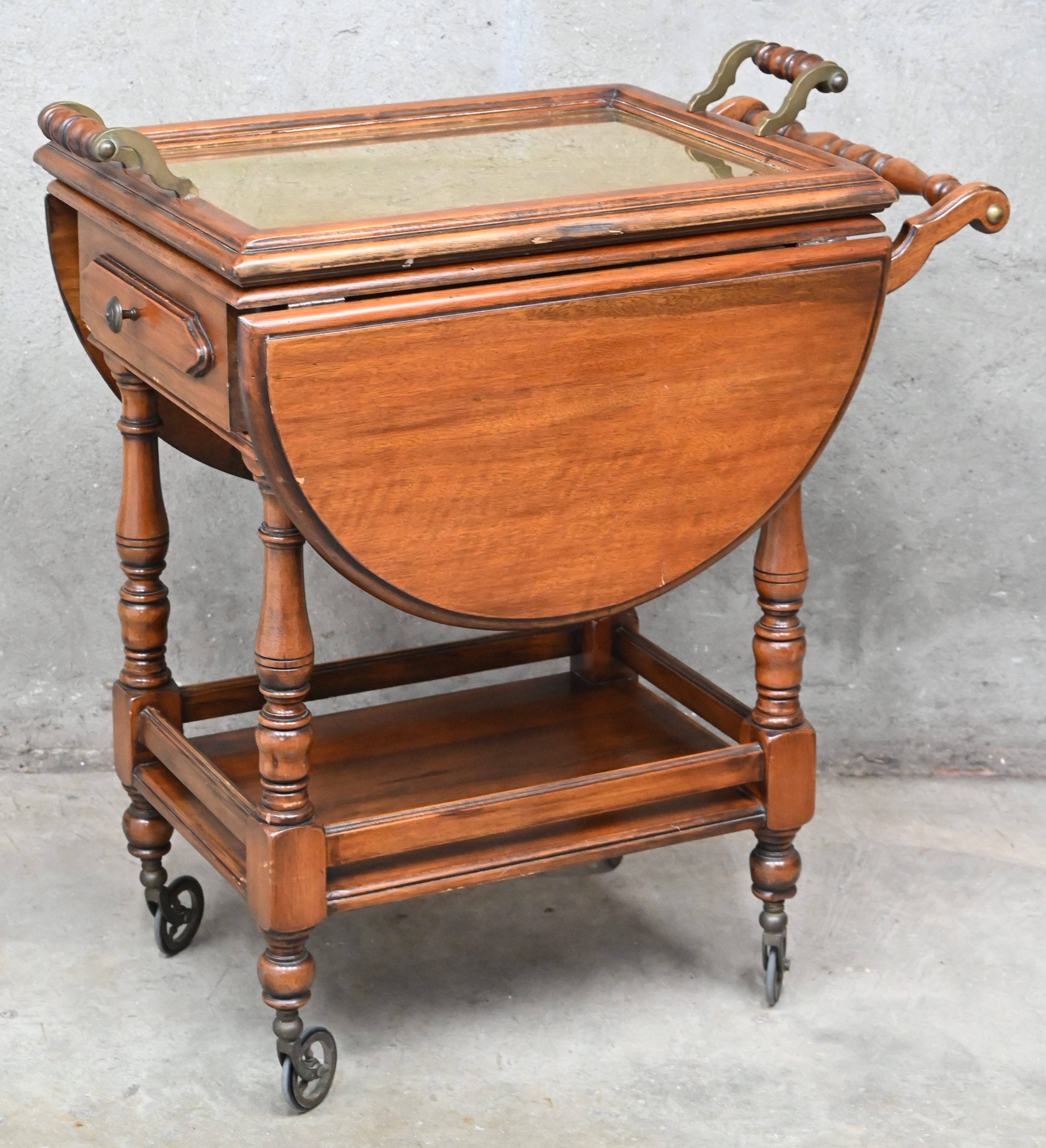Een rustiek houten bartrolley met klapbladen en een afneembaar dienblad van hout en messing. Eén van de klabbladen is hersteld aan de scharnier.