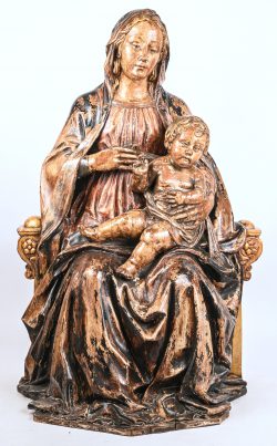 #153Een 18e eeuwse houten Madonna met kind, resten van polychromie.