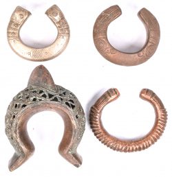 Four brass and/or bronze bracelets, one large with openwork motif, the others engraved. From Cameroon.Place a bid ›Estimate: € 80 / 220