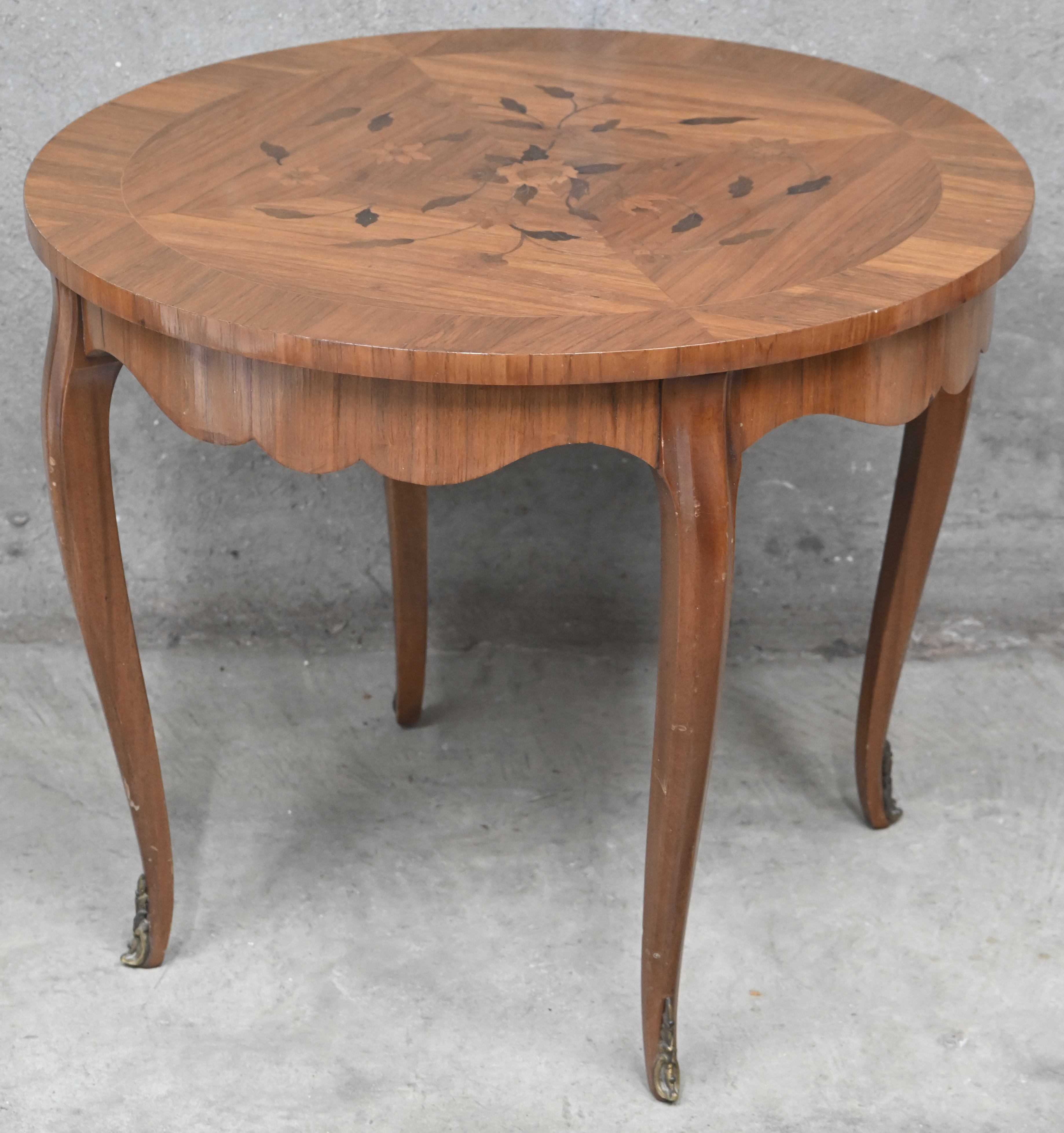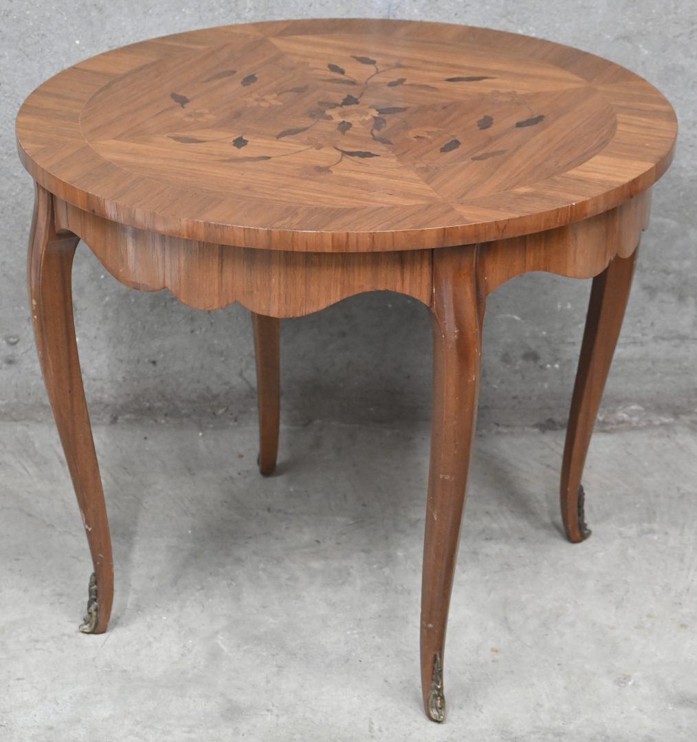 Een ronde salontafel in marquetterie.