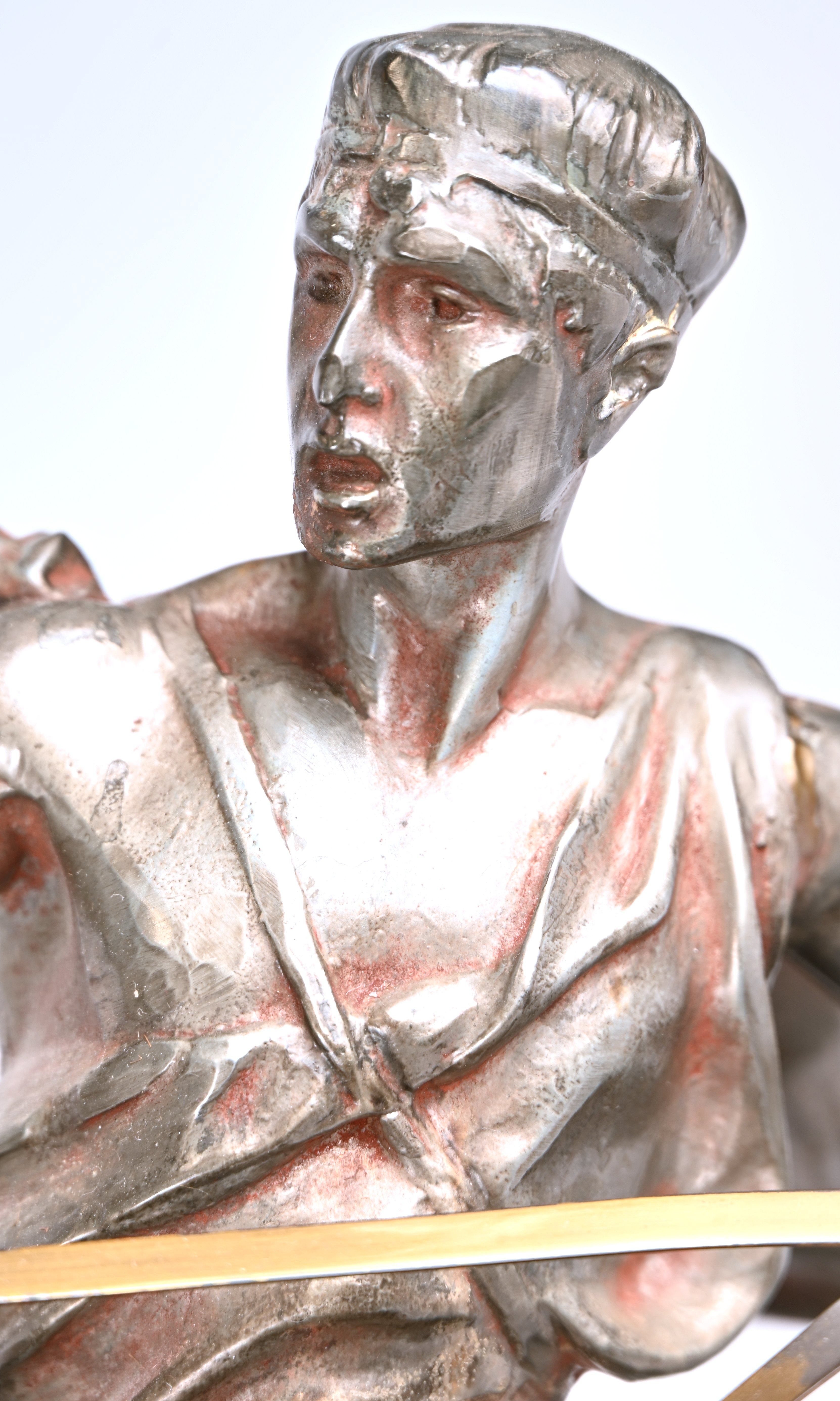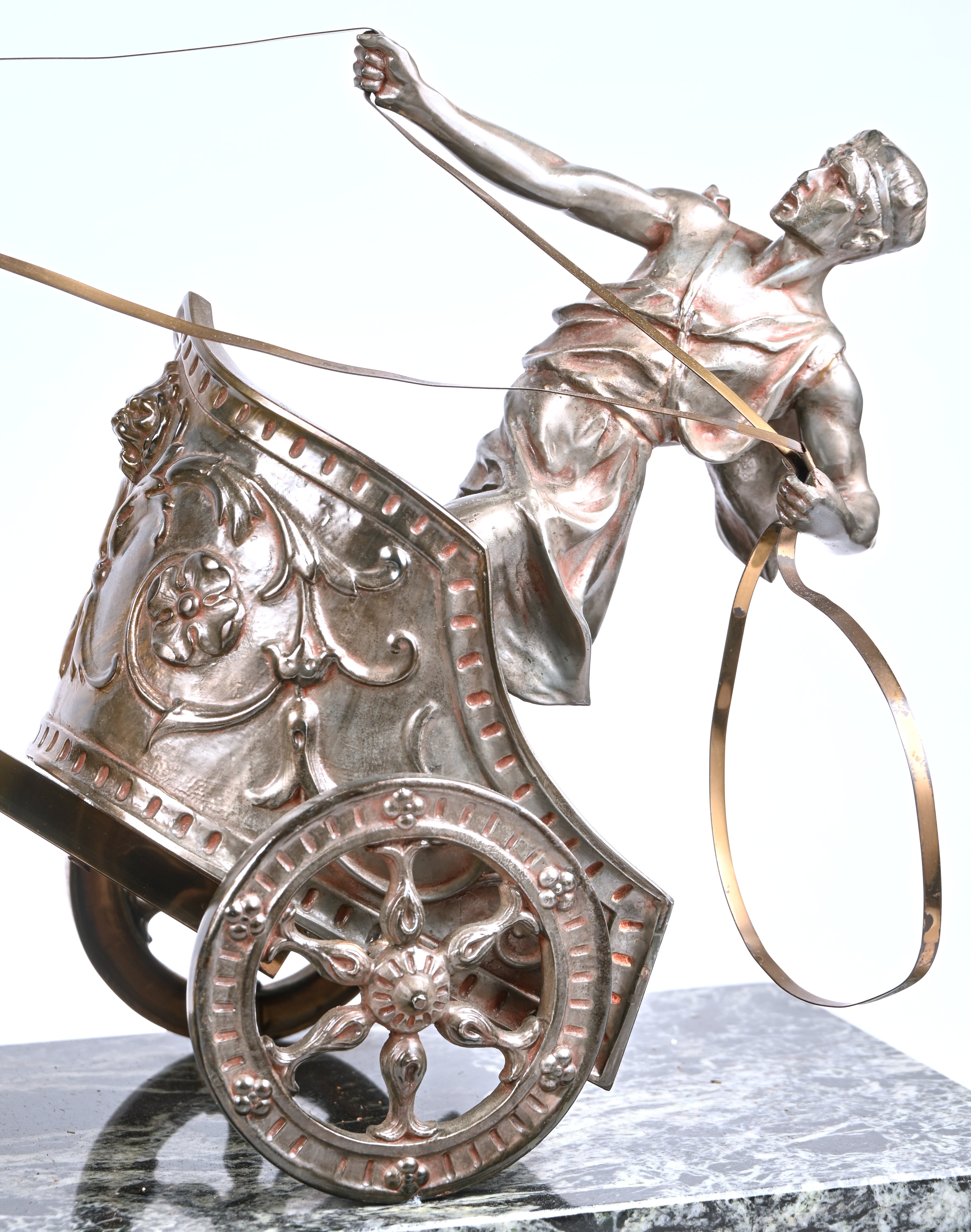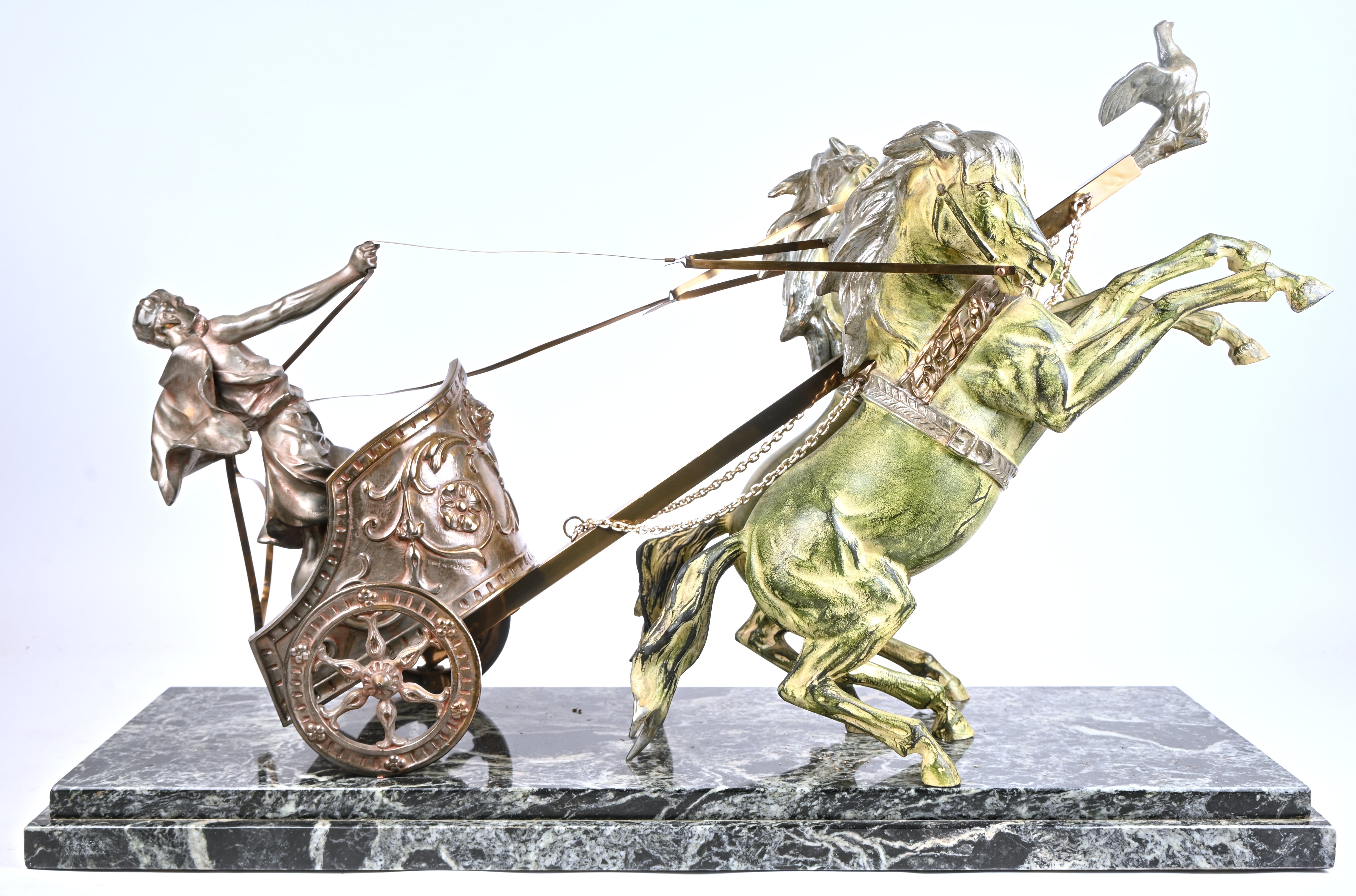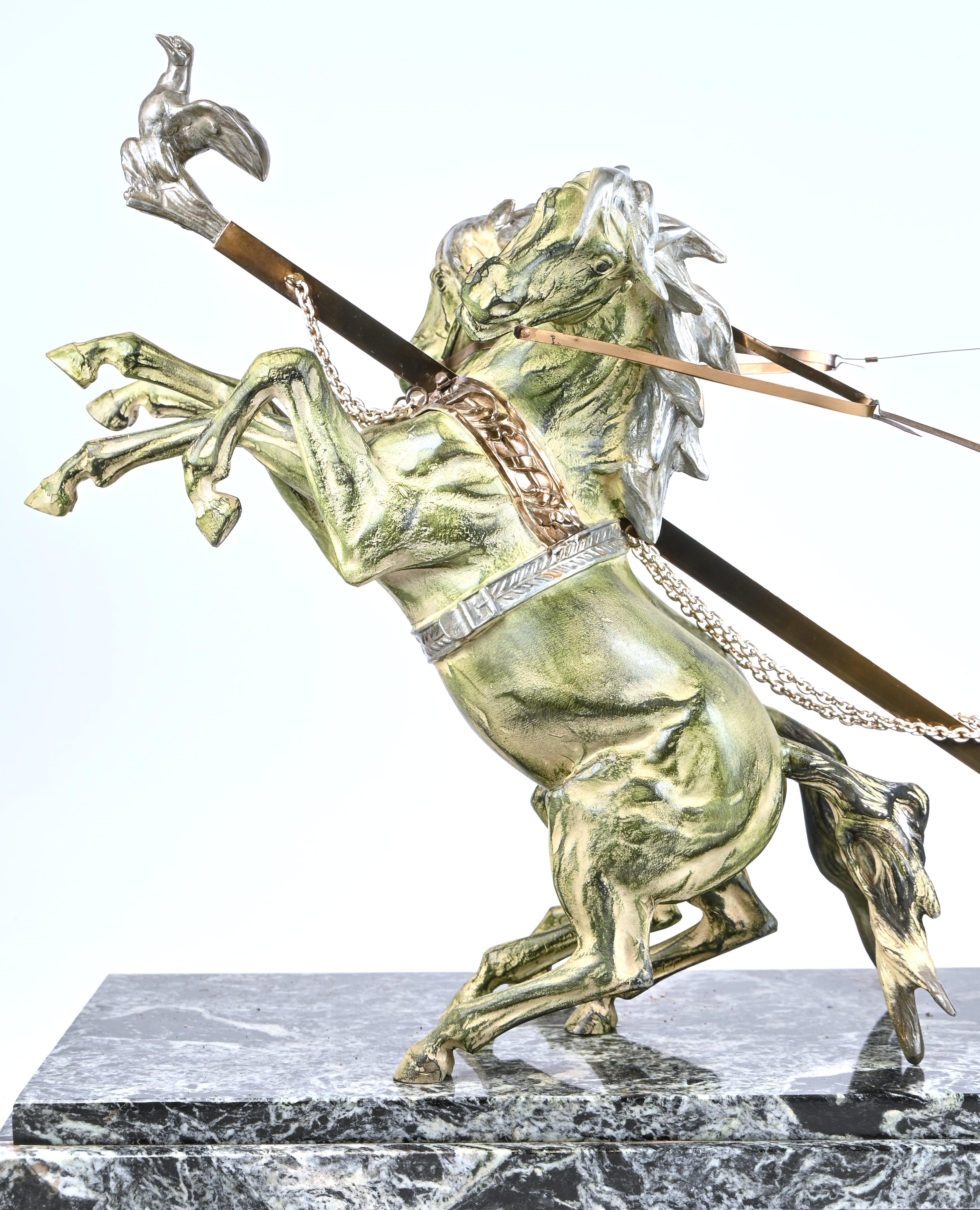 #157Parrot FrèresEen grote 19e eeuwse Boulle pendule gedragen door 4 vergulde paarden met bovenaan een gezeten Athena. Gemerkt op het mechanisme ‘Parrot Frères, Medaille de Bronze 1878. De koperen marquetterie is op meerdere plaatsen gelost en het glas manco.