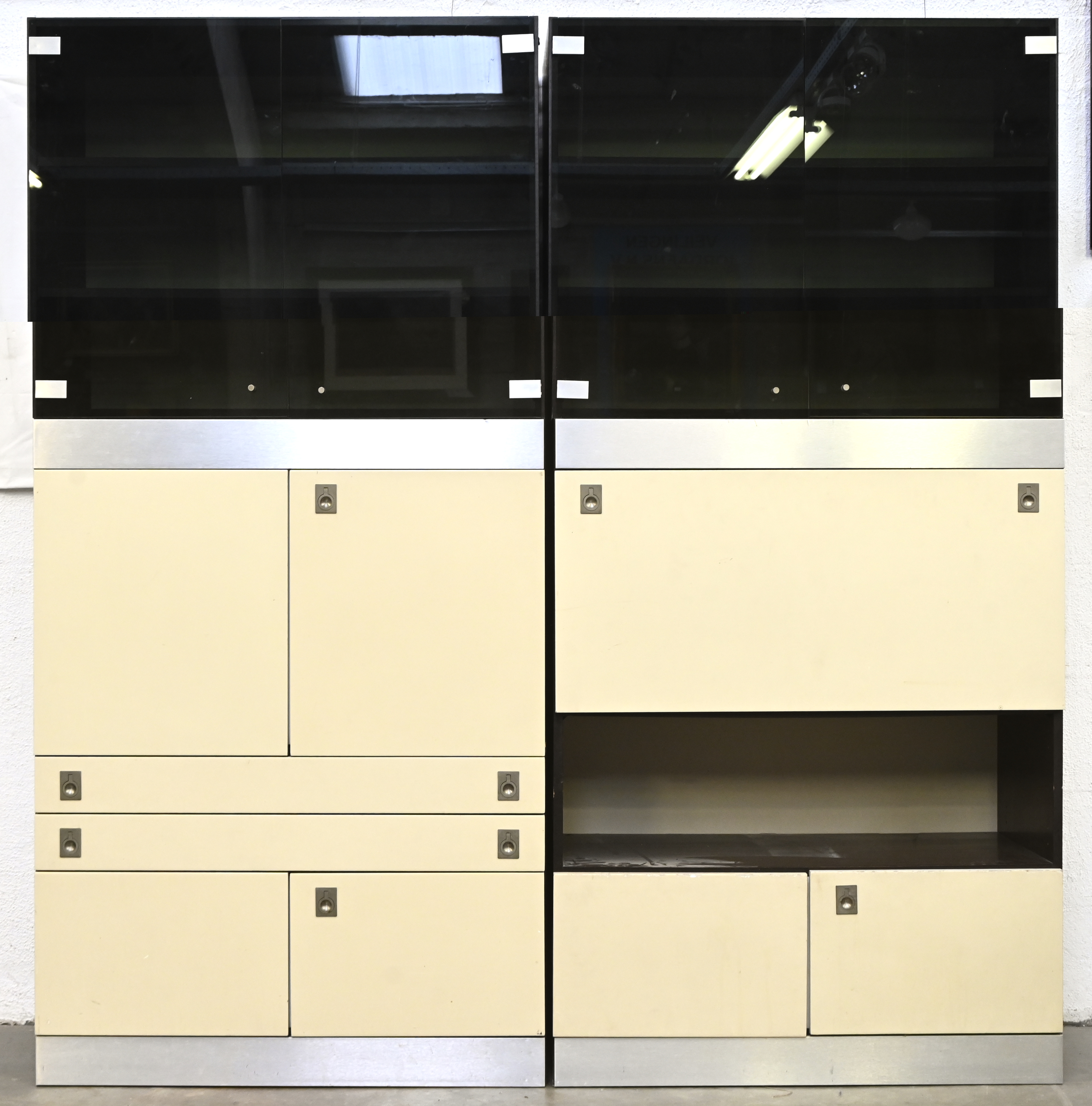 Een Scandinavische wandkast met fumee glazen deuren. Jaren 70 vintage, gestempeld op de rug ‘Made in Sweden’.