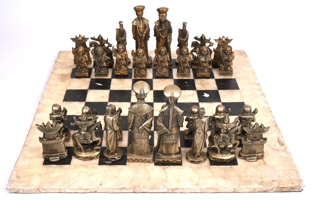 Een schaakbord met grote bronzen schaakstukken in Chinese stijl. Bord dient gerestaureerd te worden.