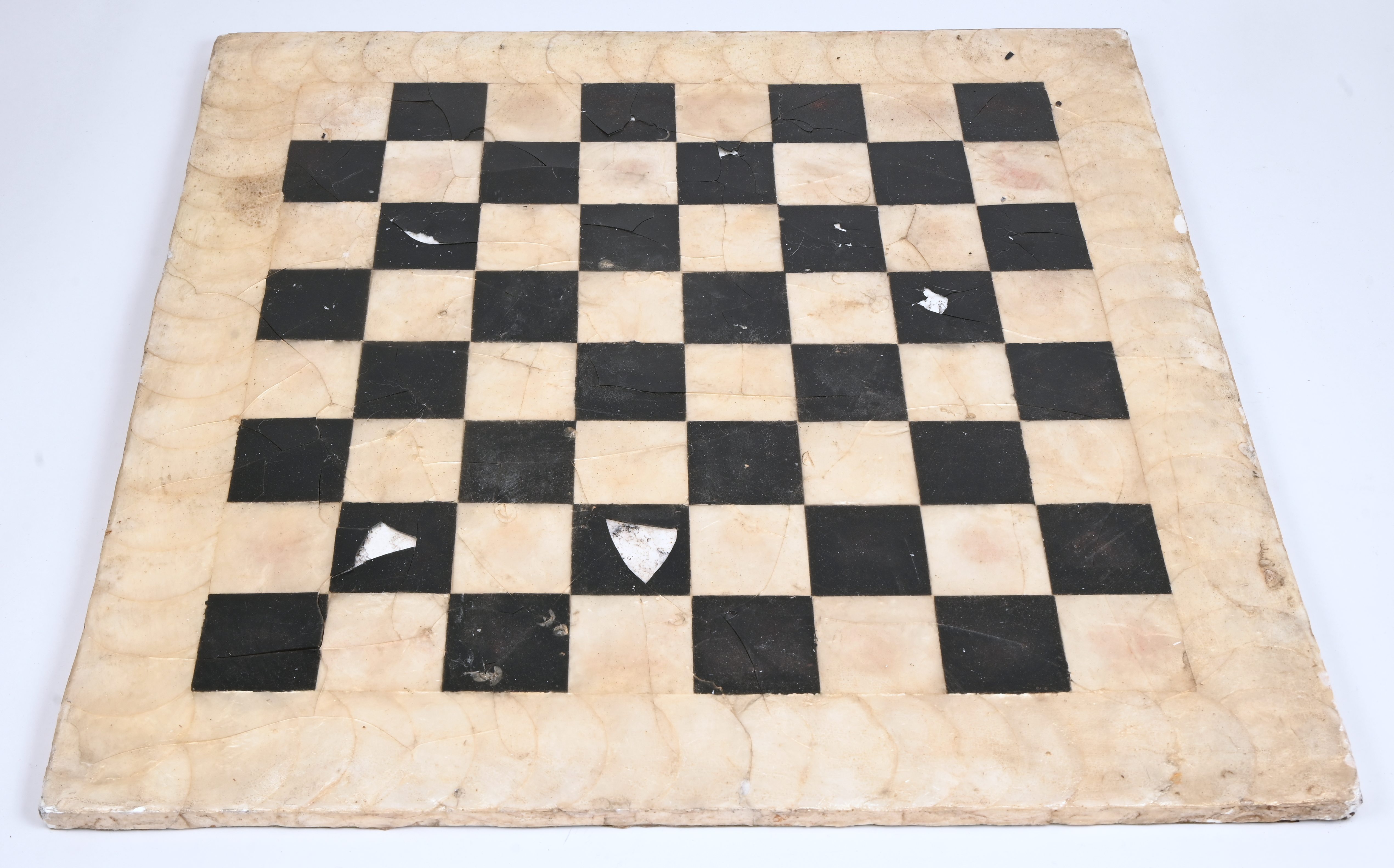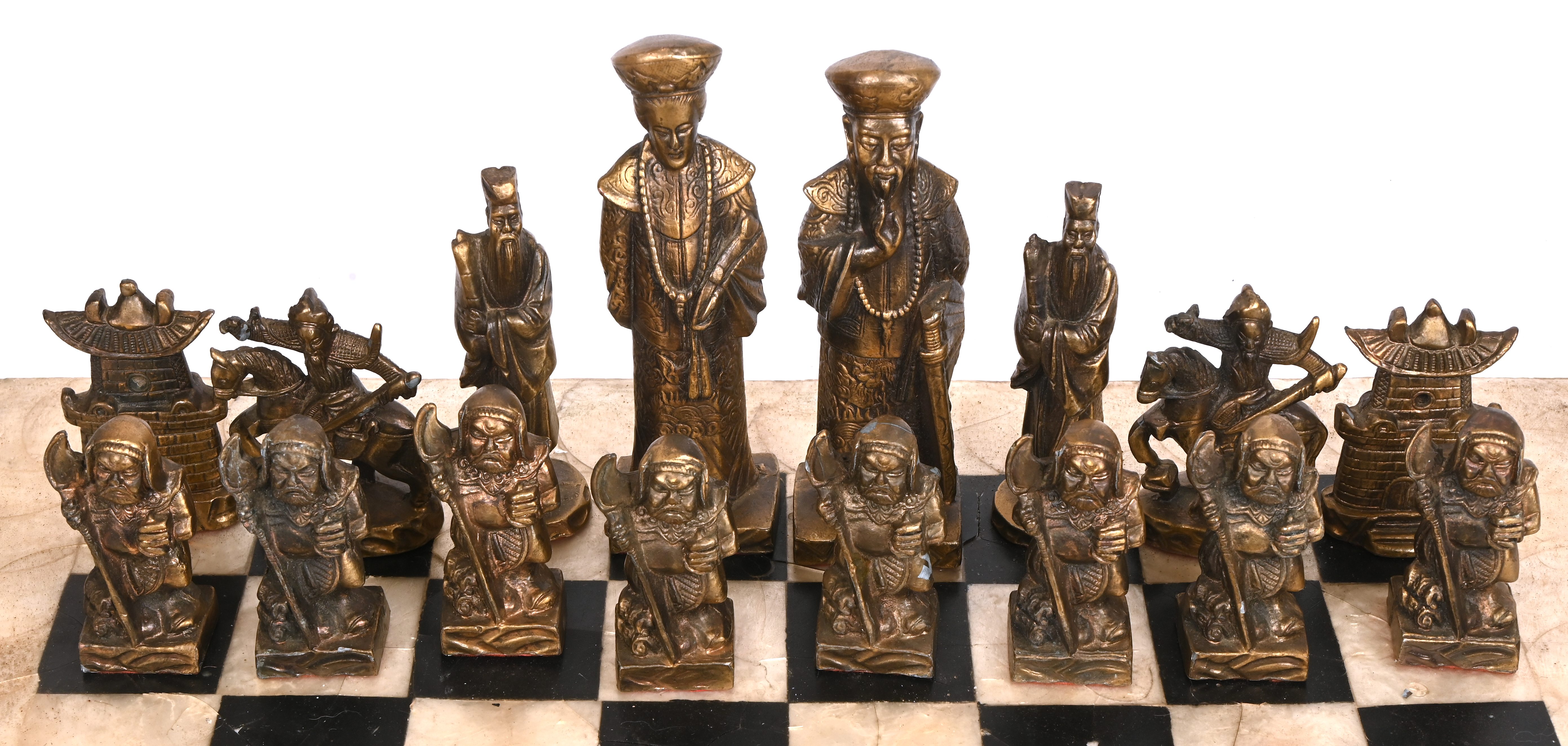 A chessboard with large bronze chess pieces in Chinese style. Board requires restoration.
