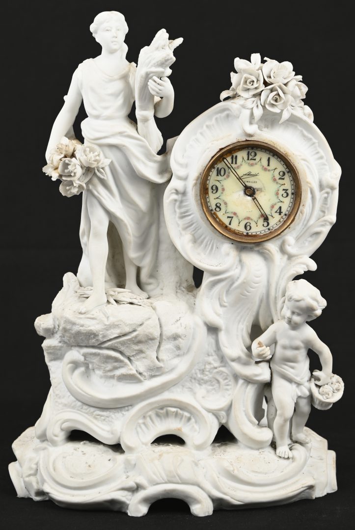 #115“Het bezoek van Amor”. Een groep van biscuit voorstellend een engel en een jongedame met ontblote borst, achteraan gemerkt Ester. Eén vleugeltje gelijmd.