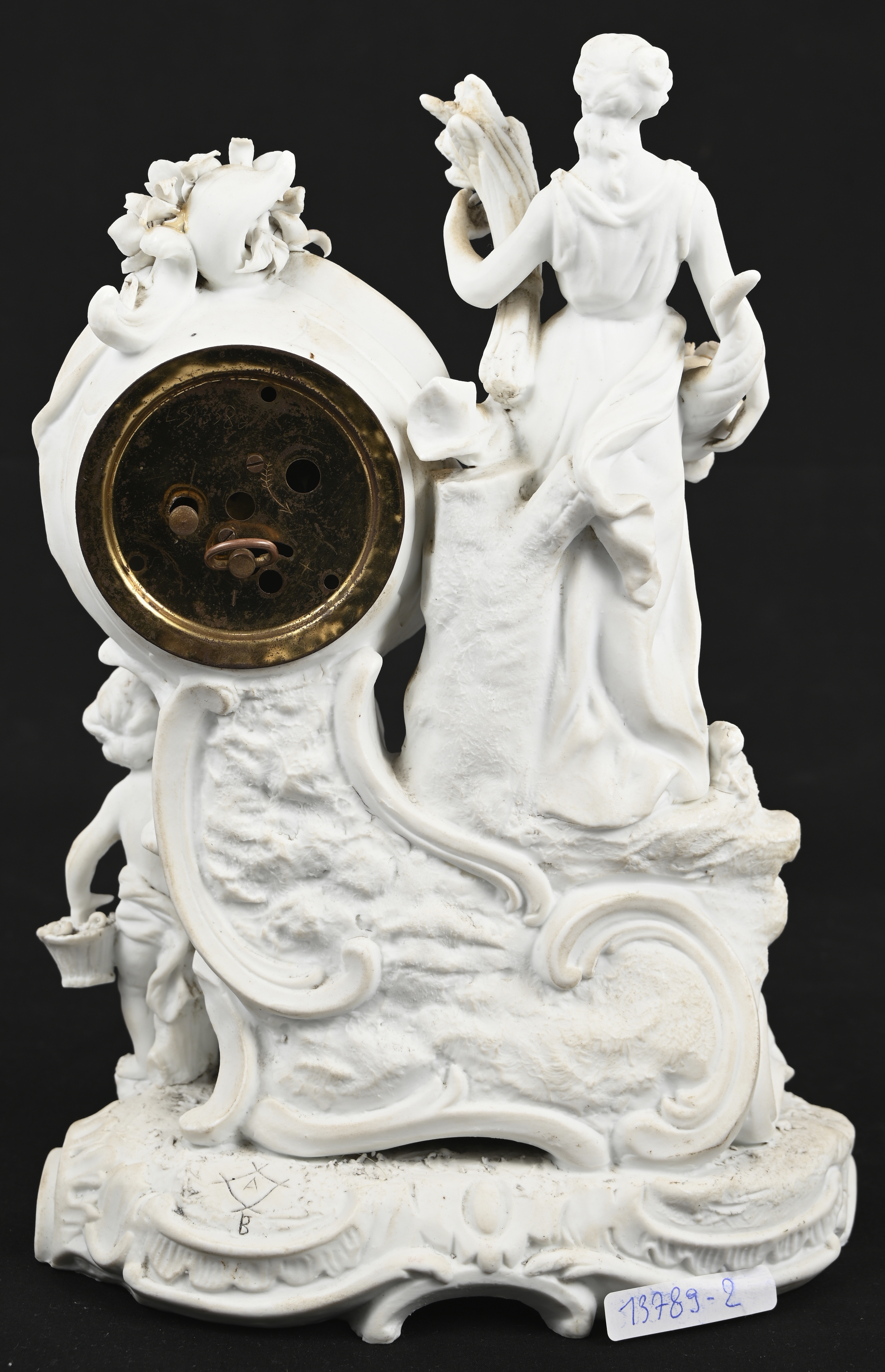 A group in biscuit depicting an angel and a young lady with exposed breast, marked on the back with Ester. One wing glued. -
