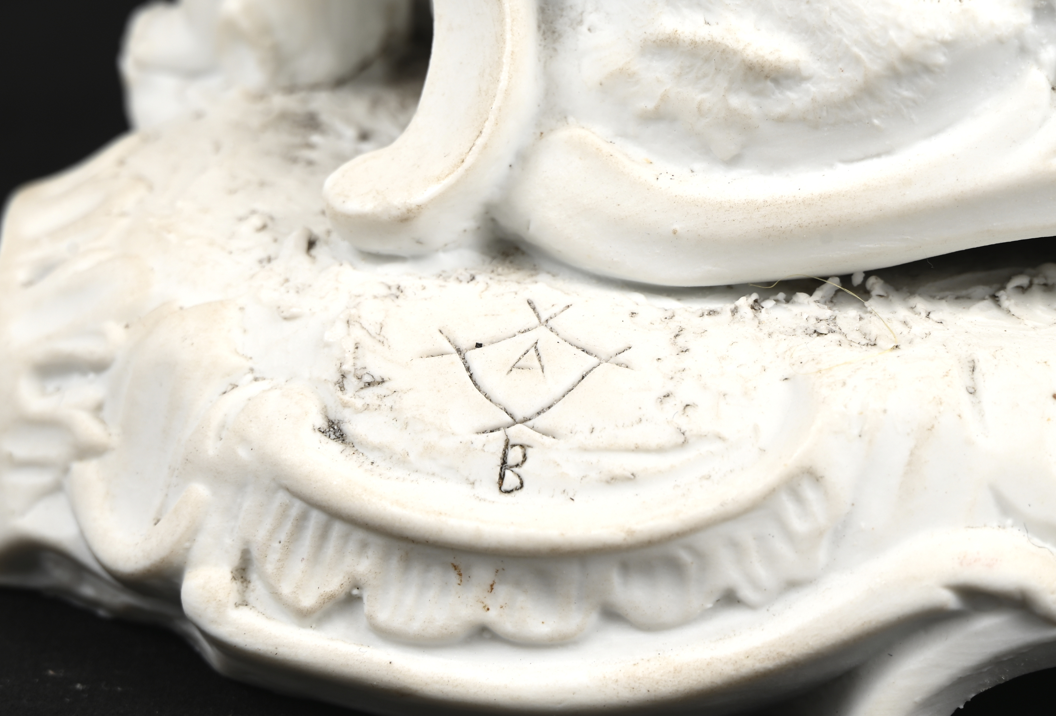 #190Een tète à tète in deels geglazuurd biscuit, gemonogrammeerd PK.