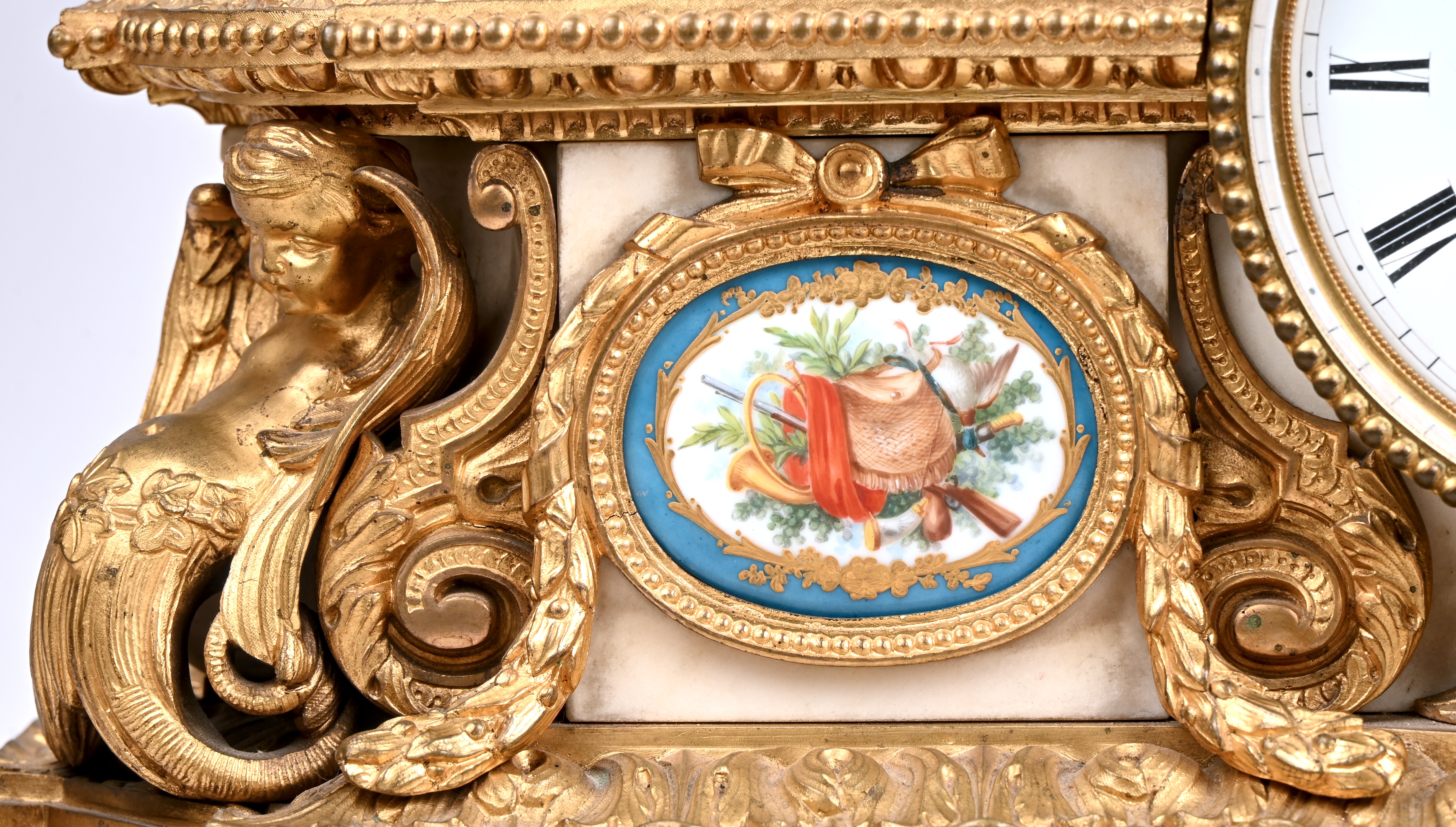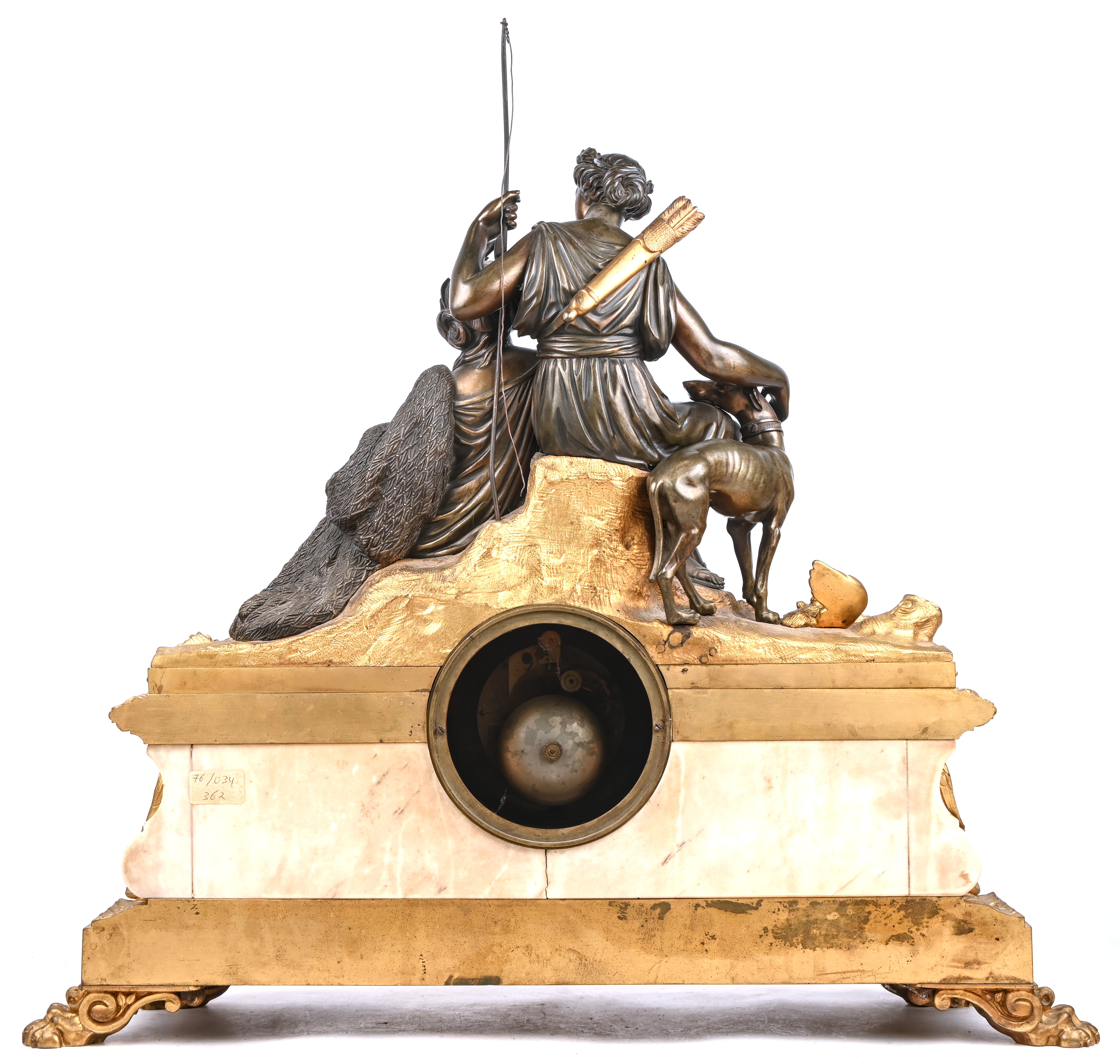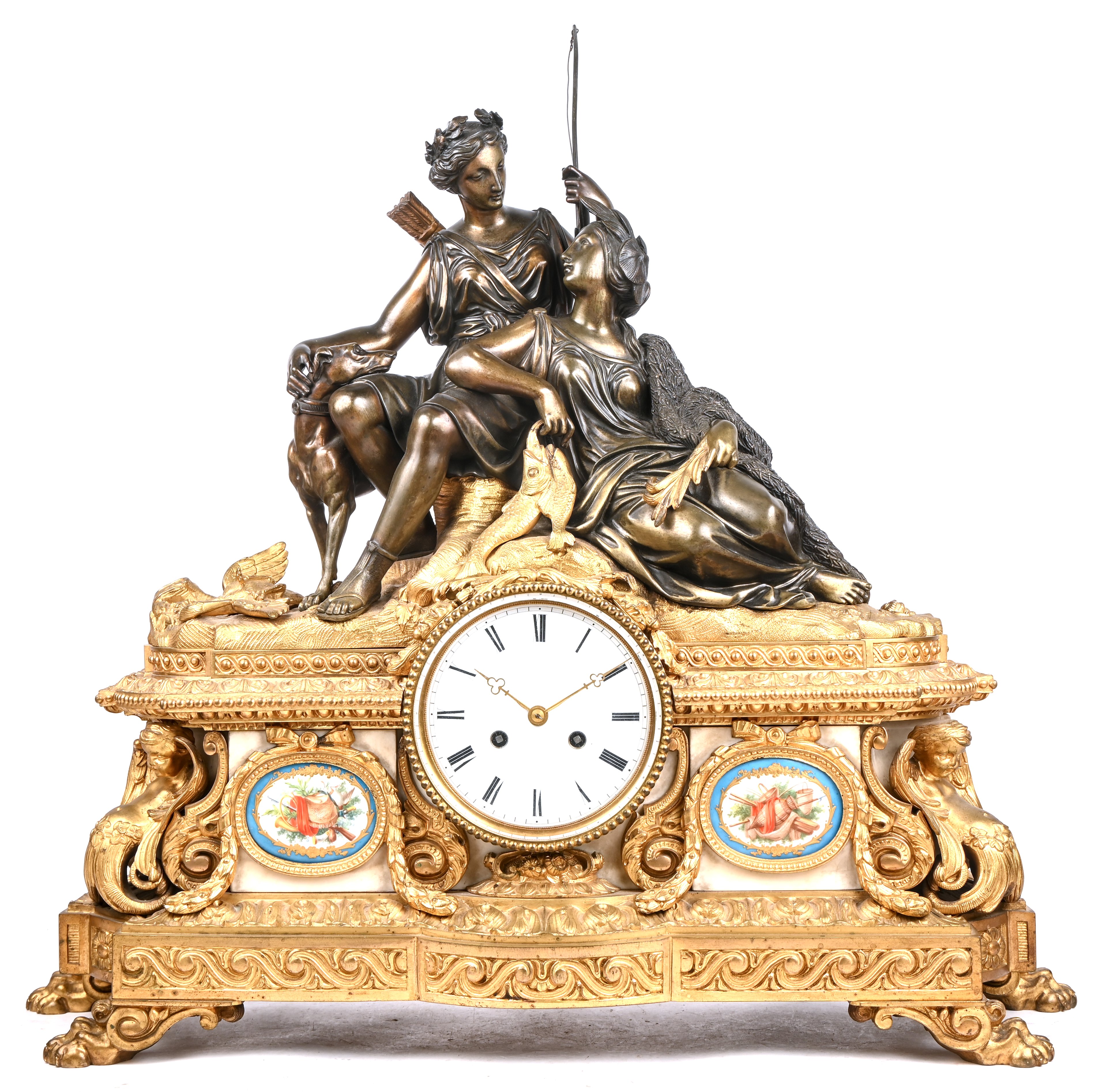 A mantel clock with a bronze hunting-themed group on a gilded base with marble and porcelain elements. Back glass broken.