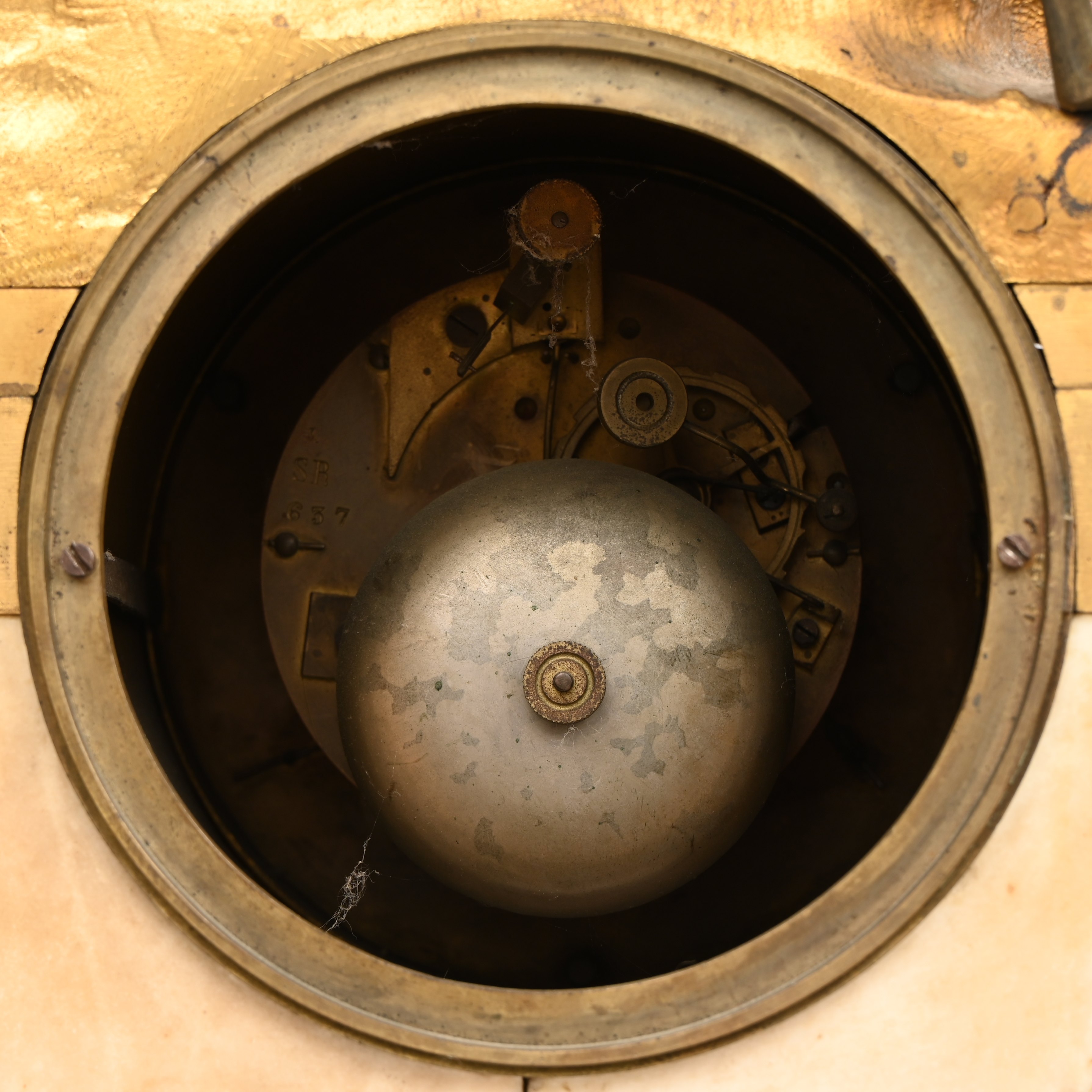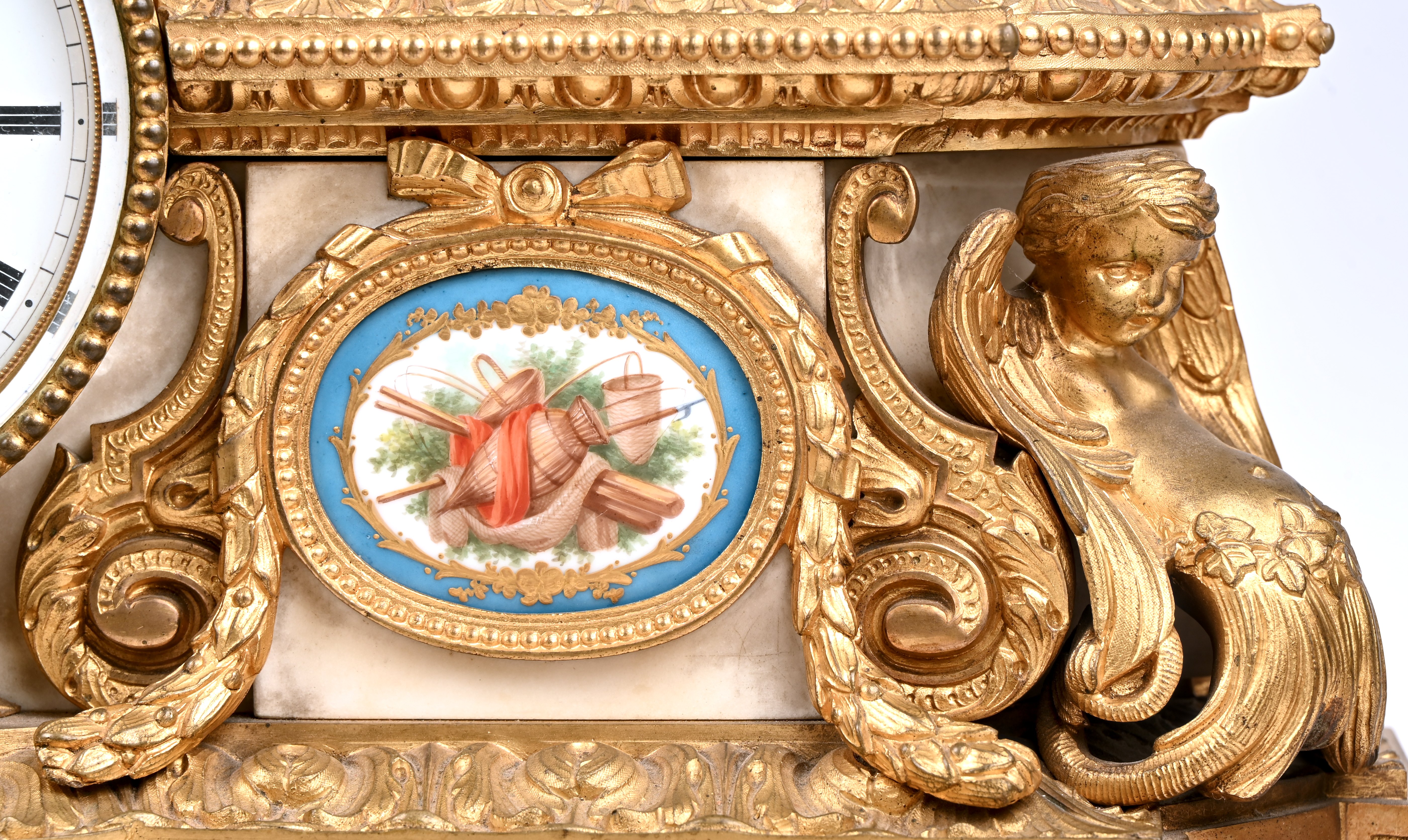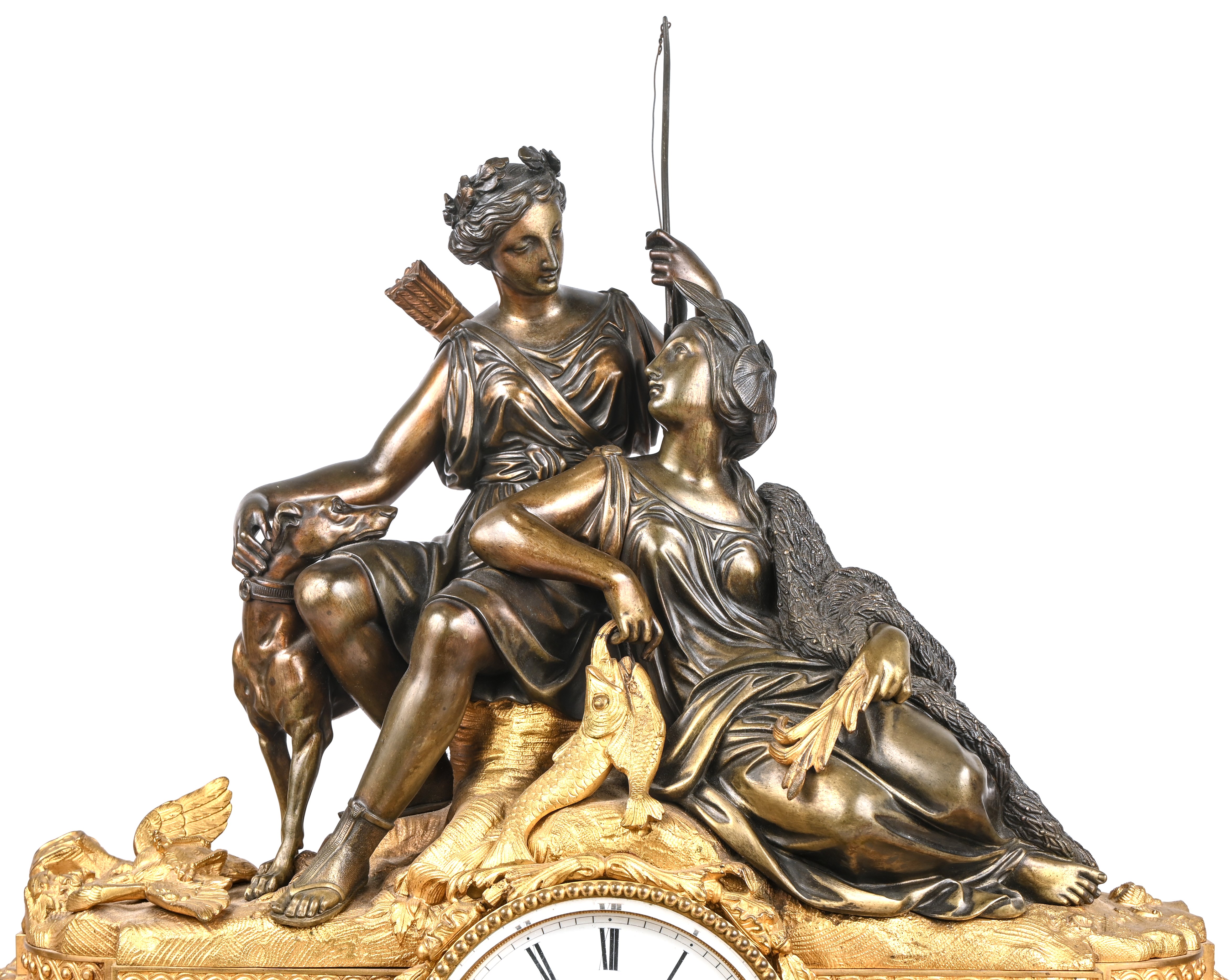 A mantel clock with a bronze hunting-themed group on a gilded base with marble and porcelain elements. Back glass broken.