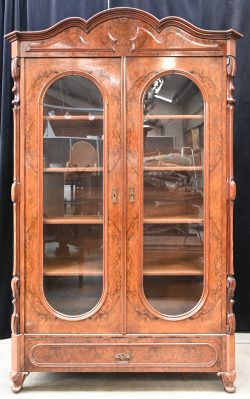 #186Een legkast met twee vitrinedeuren en onderaan één lade. Wortelfineer.