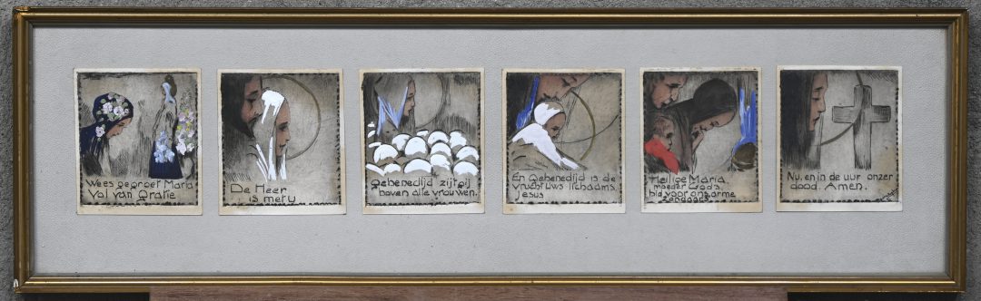 Een gevarieerd lot kaders, bestaande uit een ets, een gravure en een tekening.