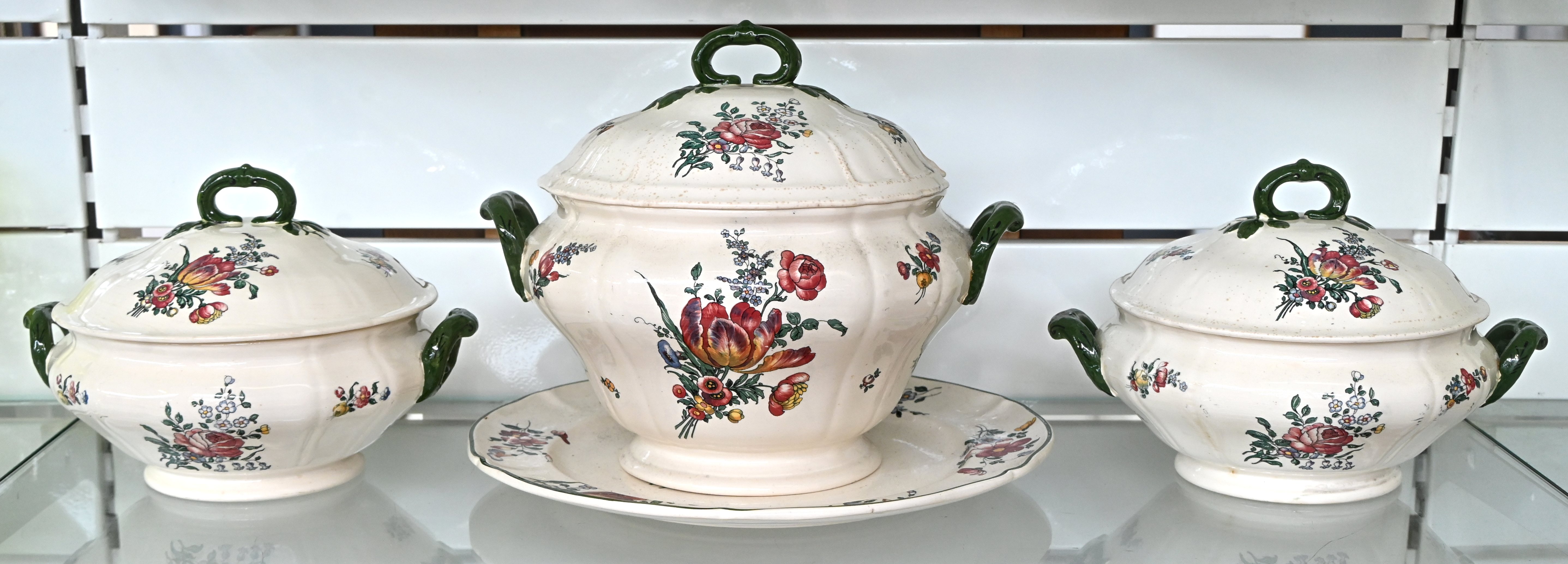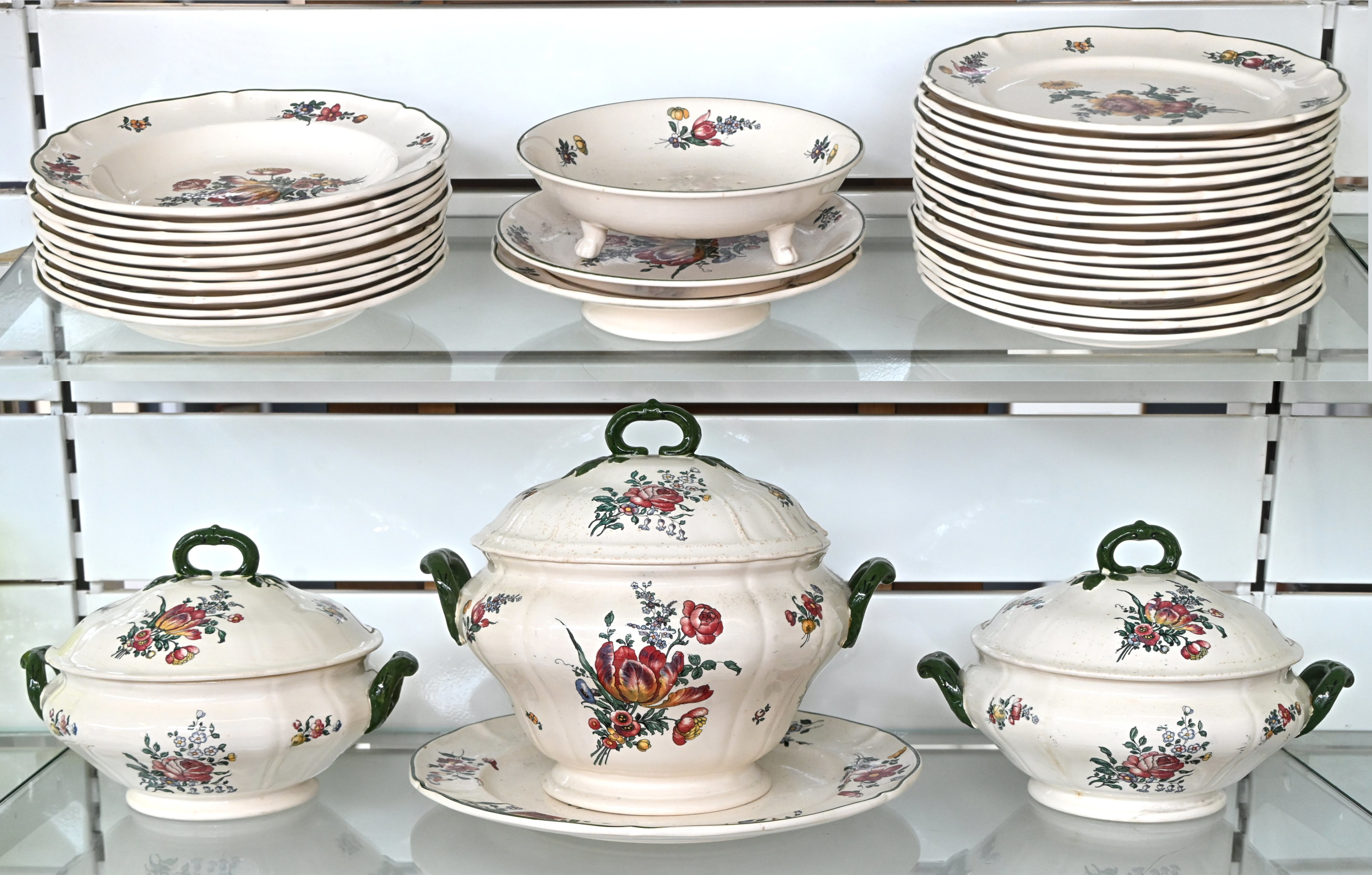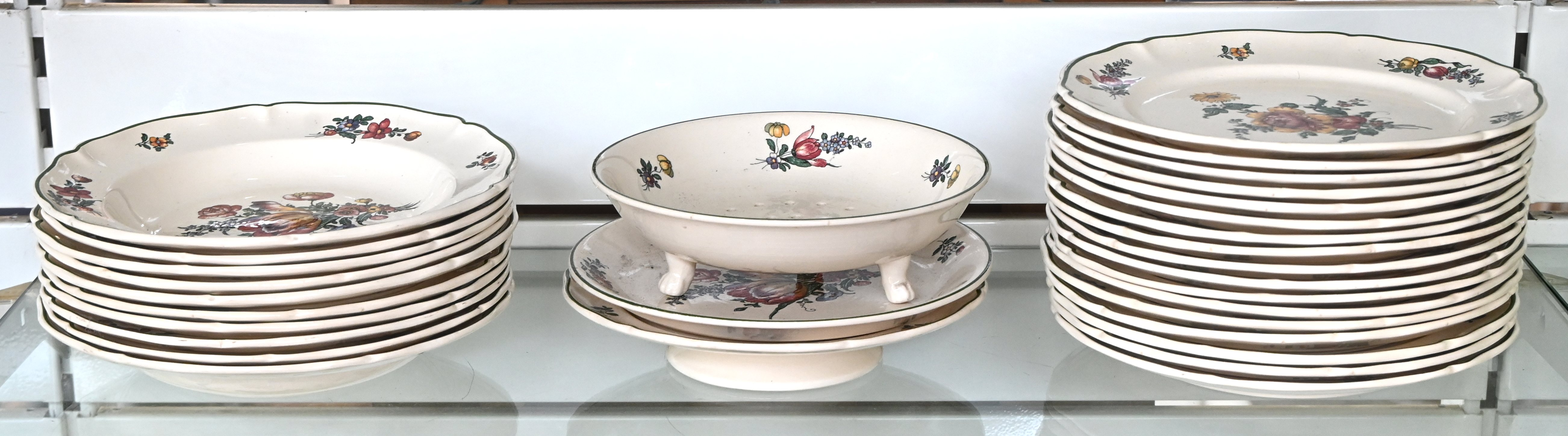 A 44-piece Boch crockery set with Acapulco decor. Includes 3 dinner plates, 6 soup bowls, 14 dessert plates, 13 saucers, and 8 cups. Chipping on 1 dinner plate, 1 soup bowl, and 1 dessert plate.No longer availableDim. Ø 15-24 cmEstimate: € 100 / 150