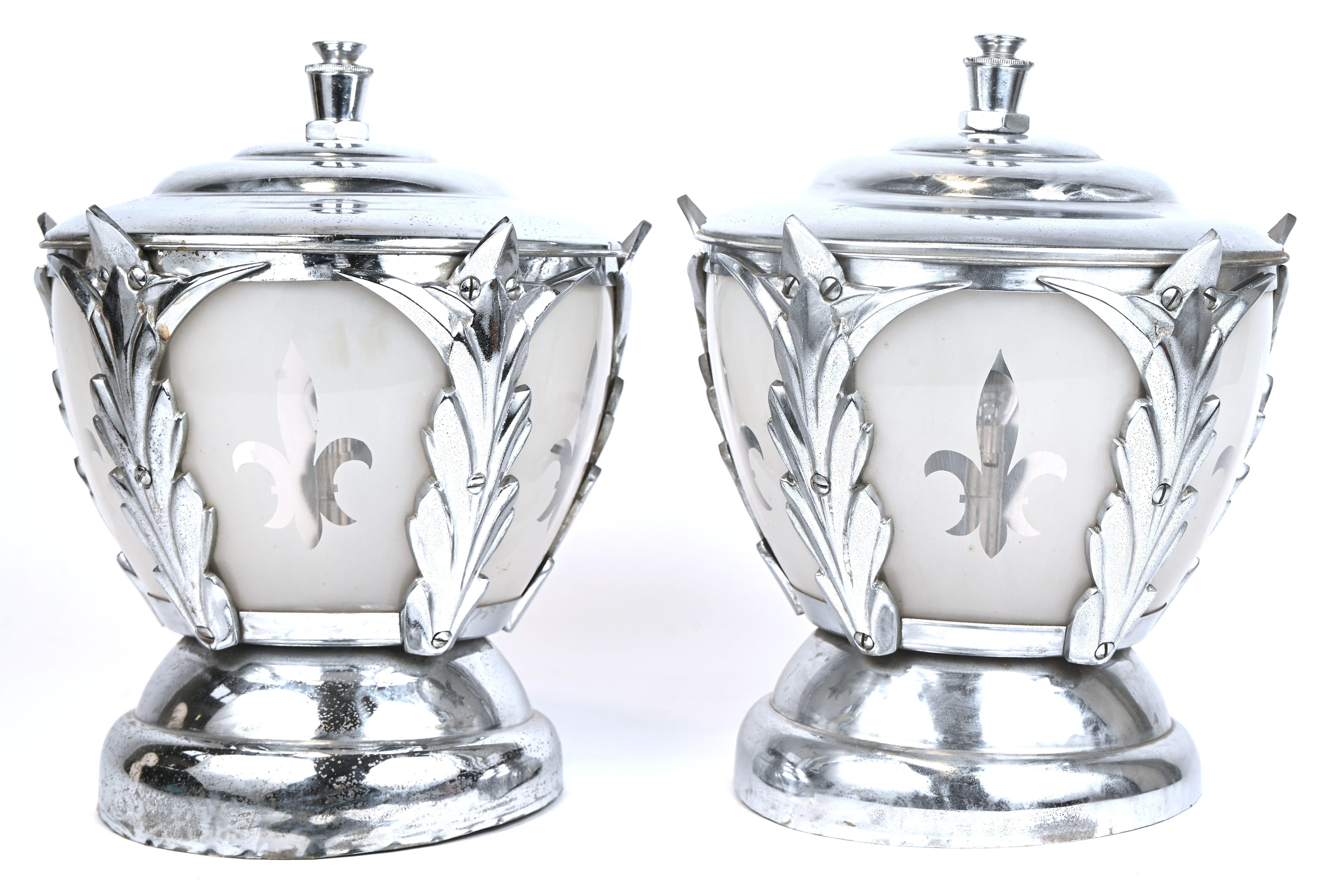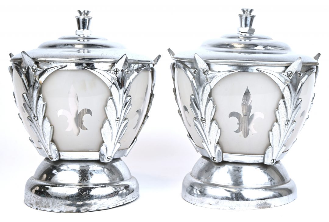 A set of lantern-shaped lamps from a hearse. Chromed metal and etched glass, with bayonet fitting.