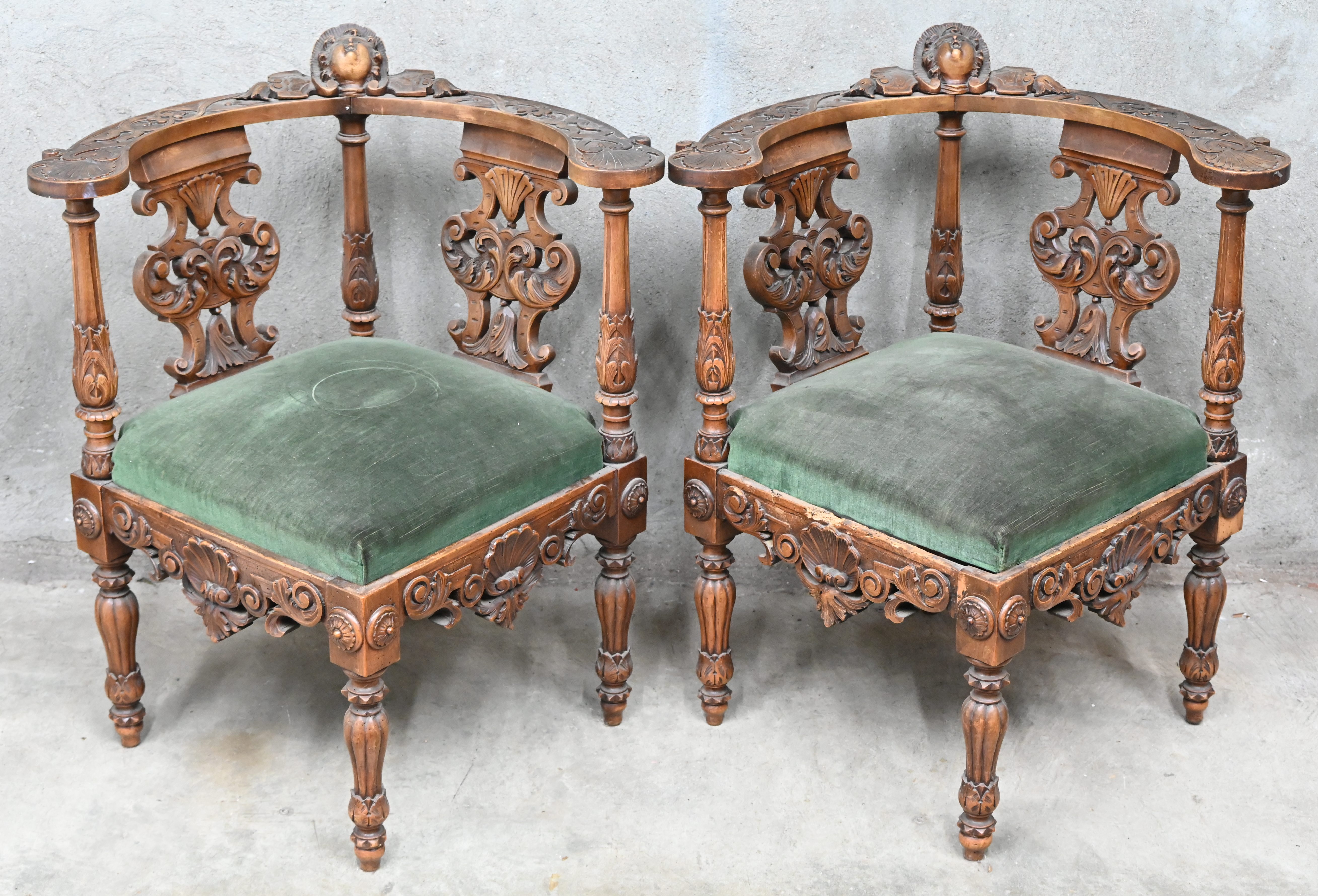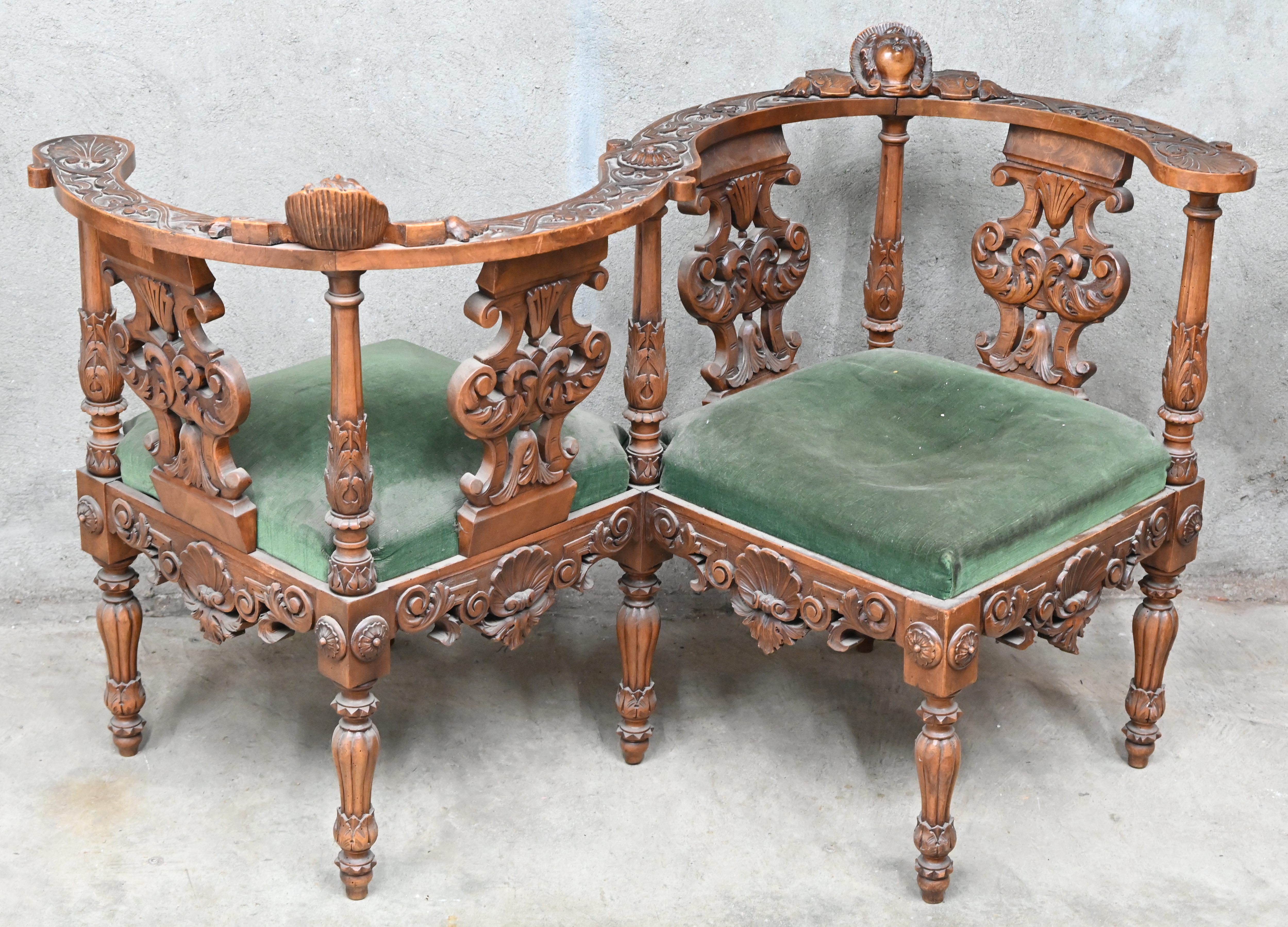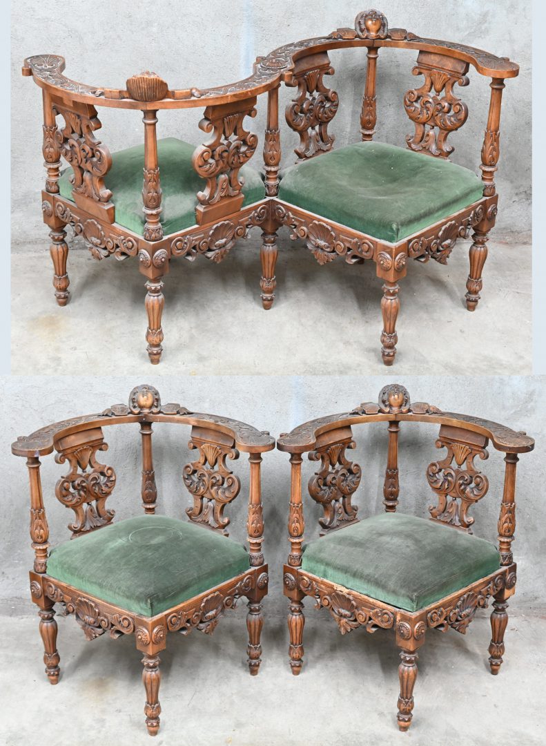 A set of solid wood corner chairs and a matching confidence bench in Louis XV style with elaborate carvings.