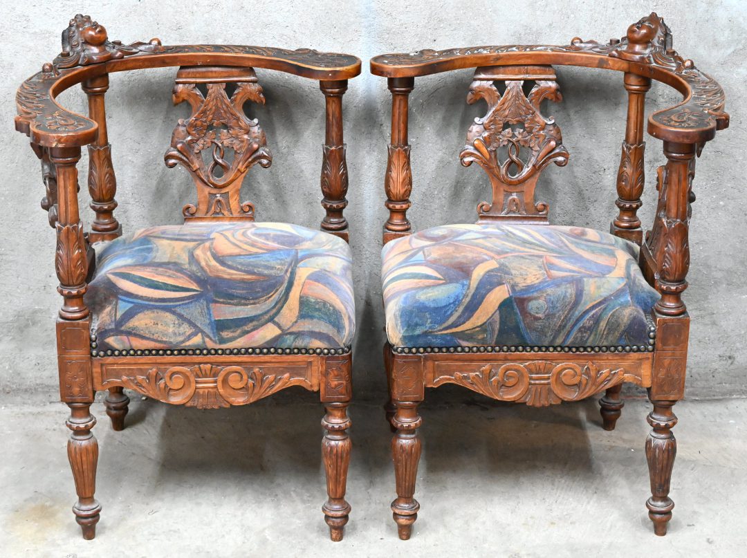 A set of solid wood corner chairs in Louis XV style with lavish carvings.