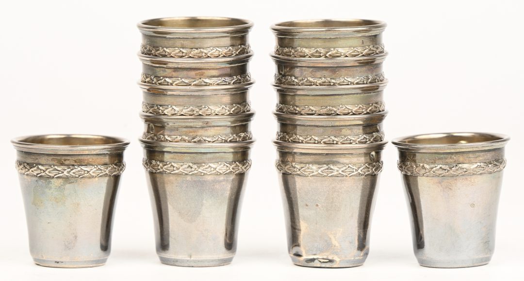 Six silver shot glasses, marked with a Minerva head. With a total gross weight of 125 grams.No longer availableDim. 125 gramEstimate: € 70 / 100 -