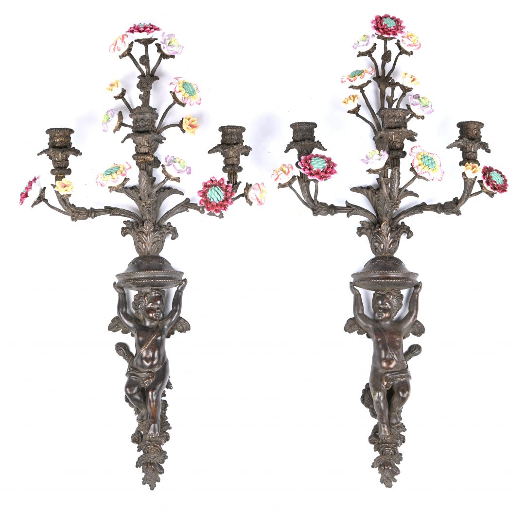 A set of 2 bronze sconces with porcelain flowers carried by angels.