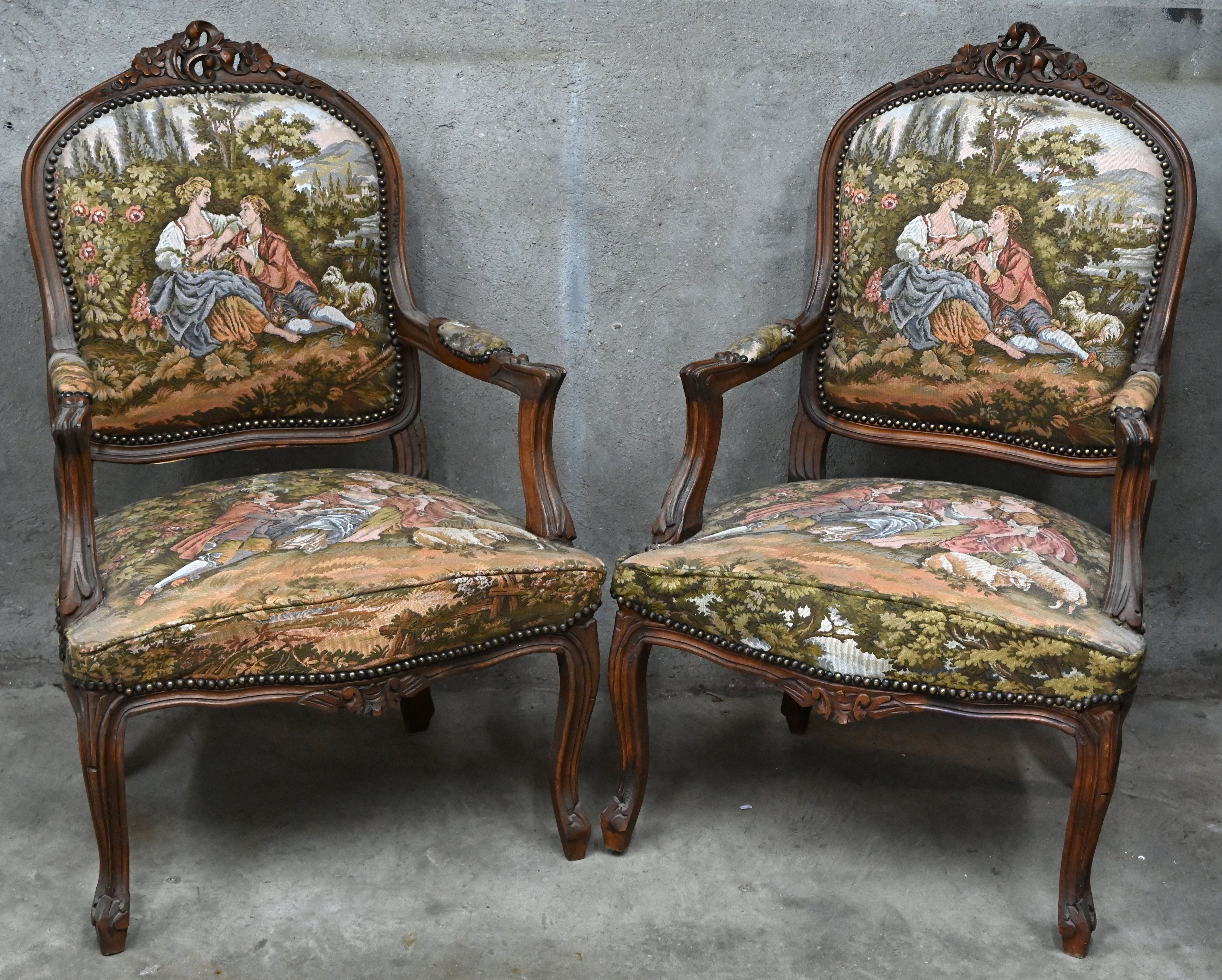 Een set van 2 eikenhouten armstoelen in Louis XV stijl met Gobelin stoffering.