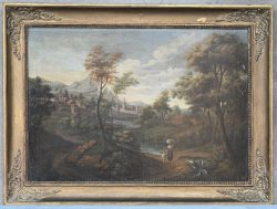 #124Een 19e eeuws landschapsschilderij, vermoedelijk Italiaanse school. Olieverf op doek, gemaroufleerd. Niet getekend.