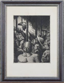 #184Frans Masereel‘l’Aigle de Distelmonde’, een monochrome ets. Getekend binnen de plaat; Frans Masereel. De ets is gemaakt voor de Contes d’Horace Van Offel, een bibliofiele uitgave met 22 kortverhalen van de auteur Horace Van Offel (Antwerpen, 1878-1944) uitgegeven door de “Editions des artistes” in Brussel in 1935.