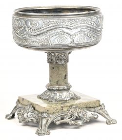 An art-deco coupe on a pedestal, made of metal and marble. The lid is missing. -