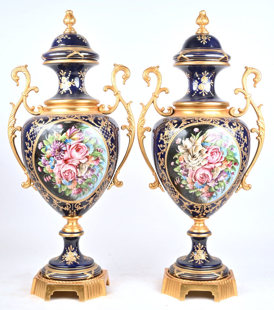 Een set van 2 kobaltblauwe siervazen in de stijl van Sèvres. Kleine schade aan één verguld deel.