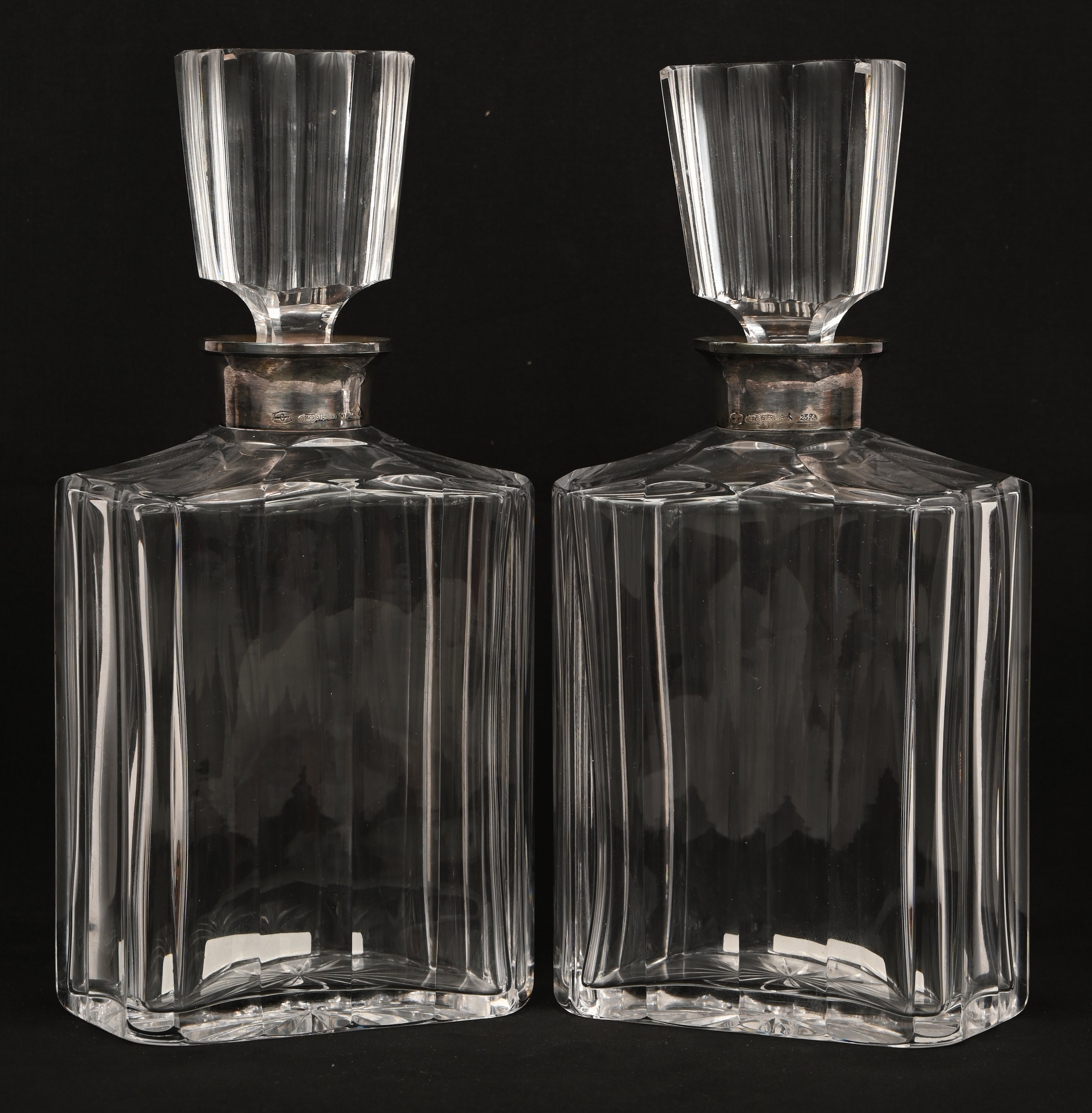 Een set van 2 kristallen karaffen met zilveren kraag, gemerkt A925 sterling. 25 gram en 26 gram zilver.