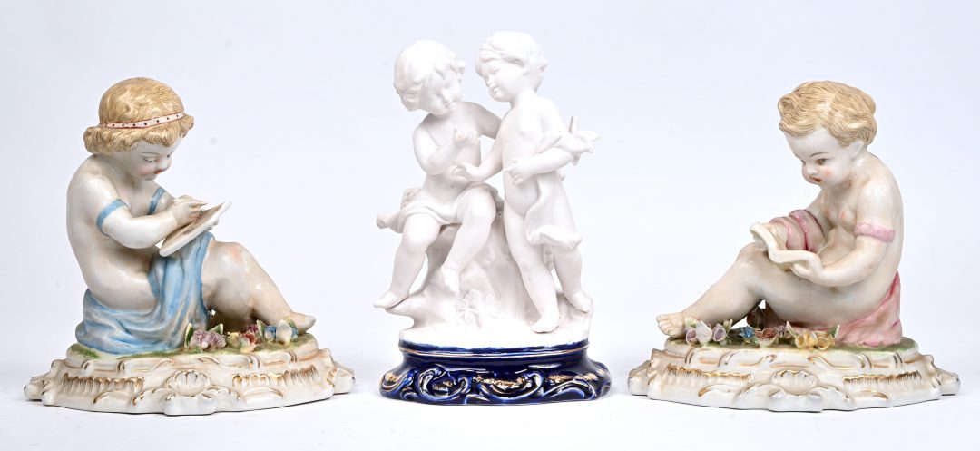 A set of 2 porcelain putti, reading and drawing, marked with crossed swords above an R. Added a pair of biscuit putti.