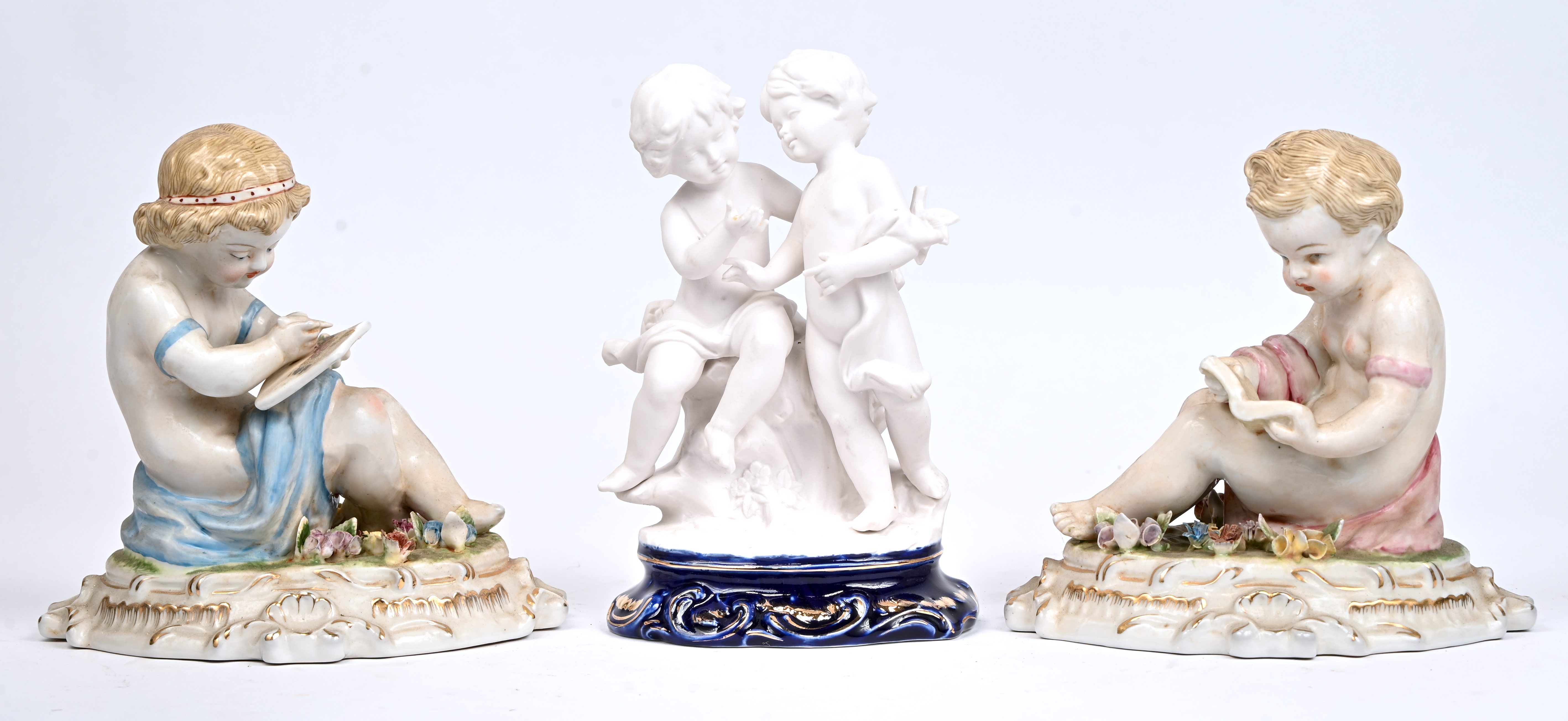 Een set van 2 porseleinen putti, lezend en tekenend, gemerkt met gekruiste zwaarden boven een R. Toegevoegd een stel putti uit biscuit.