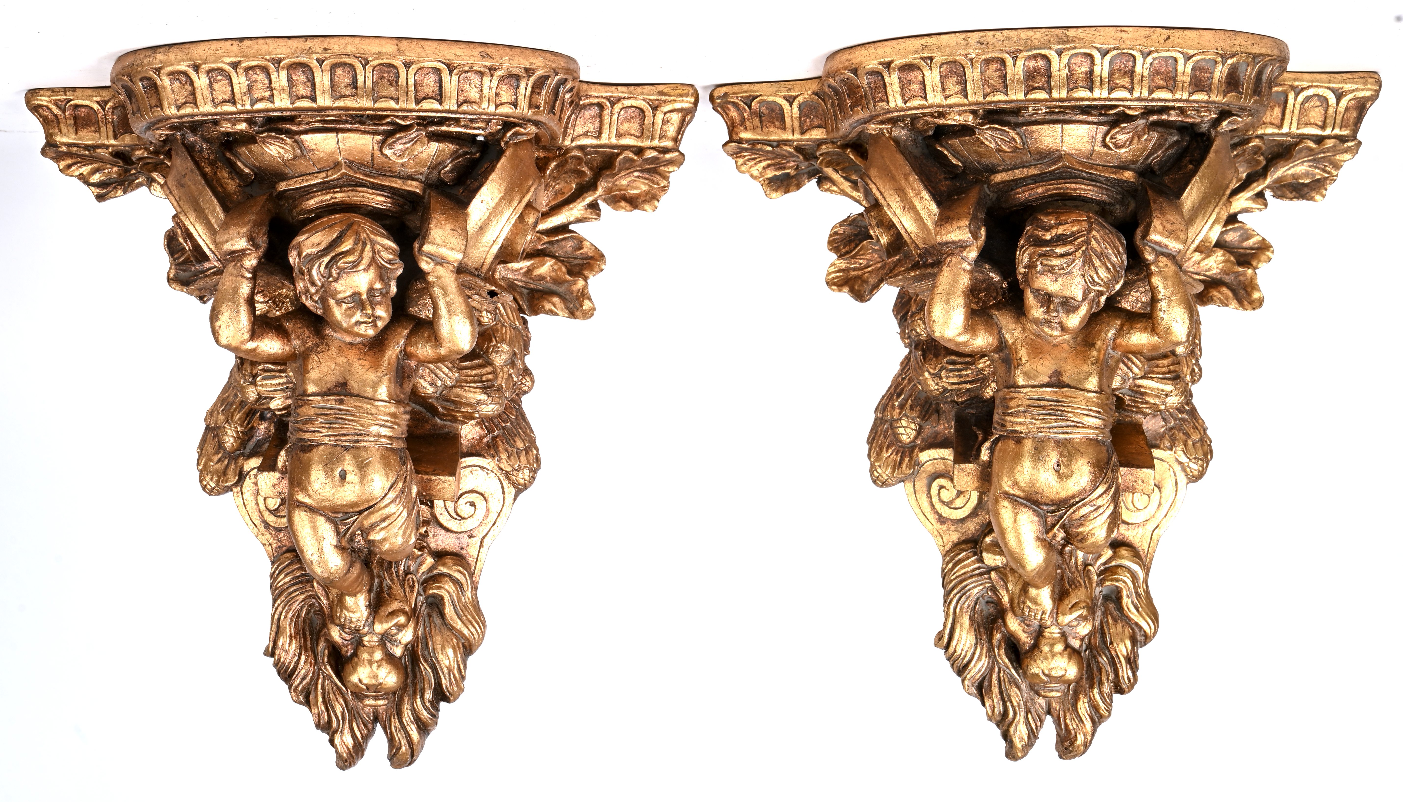 A set of 2 gilt wall brackets, wood and plastic, carried by angels.