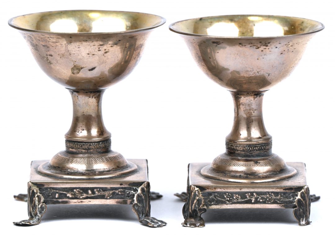 Een set van 2 verzilverd metalen schaaltjes op voet, één voetje manco.